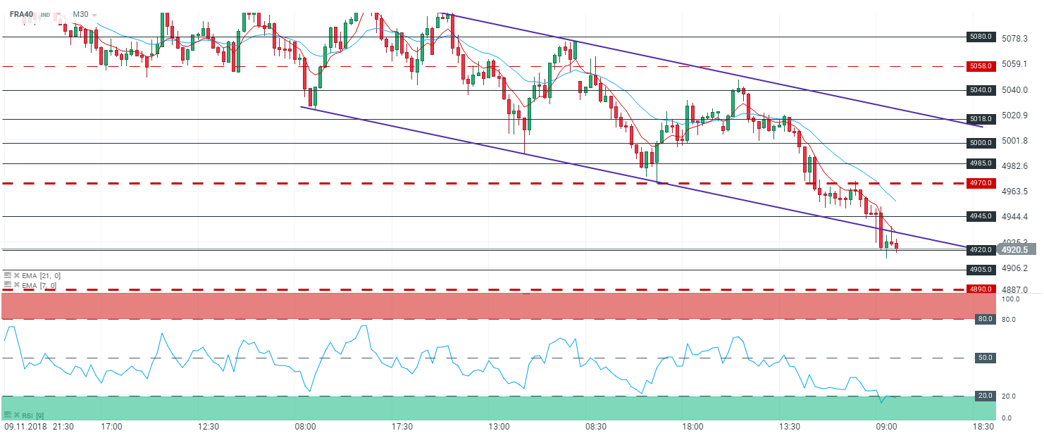 En 30 minutes (M30), l’indice français (FRA40) évolue en tendance baissière. Les cours sont capés par les moyennes mobiles à 7 et 21 périodes. Le RSI est orienté à la hausse au sein de sa zone de « sur vente » et oscille à 17,7 points. Les cours semblent consolider sur la zone des 4 920 points. Dans ce contexte nous serons haussier sur l’indice français avec en ligne de mire le niveau des 4 945 points.