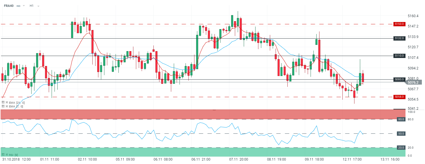 En unite de temps horaire (H1), l’indice français (FRA40) évolue au sein de son range compris entre 5 150 et 5 058 points. Les cours évoluent sous leur moyenne mobile à 21 périodes, mais restent capés par leur moyenne à 7 périodes. Le RSI est orienté à la baisse sur sa zone de neutralité et oscille à 47,8 points. Dans ce contexte, nous proposons deux plans de trading :