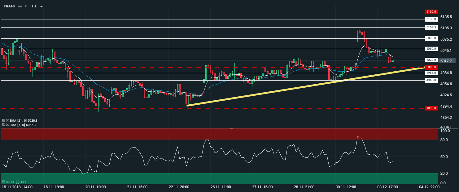 En unité de temps horaire (H1), l’indice CAC 40 (FRA40) évolue en tendance haussière. Les cours évoluent au-dessus du support oblique identifié depuis 23 novembre. Les prix sont cependant capés par les moyennes mobiles à 7 et 21 périodes. Le RSI tend à s’aplatir et oscille à 38,5 points. Dans ce contexte, nous serons haussier sur l’indice avec comme objectif le niveau des 5 050 points.