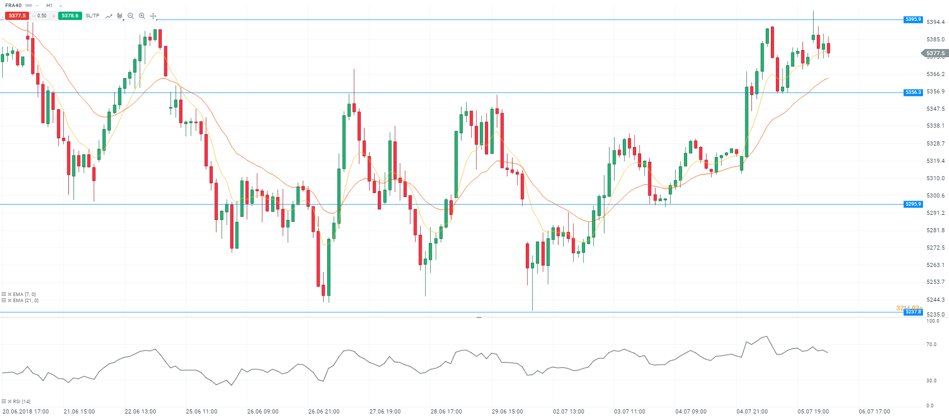 Pour l’heure, les Bourses européennes progressent. Les opérateurs demeurent prudents suite à l’instauration de droits de douane par la Chine et les Etats-Unis. Ces derniers craignent une amplification dans le conflit sachant que Donald Trump a annoncé vouloir taxer 500 milliards de dollars de produits chinois à long terme. Jeudi, les indices européens ont été soutenus par les propos d’Angela Merkel. Cette dernière s’est prononcée en faveur d’un abaissement des taxes sur les importations de véhicules américains dans l’Union européenne. Du côté des valeurs, ArcelorMittal gagne 1,33% après un relèvement de la recommandation de Macquarie. Concernant l’analyse technique, les cours fluctuent autour de la moyenne mobile courte (à 7 périodes) en unité de temps horaire (H1). Le RSI est stable proche de sa zone de surachat. Ces éléments nous conduisent à avoir une préférence à l’achat avec pour objectif le niveau des 5 395 points.