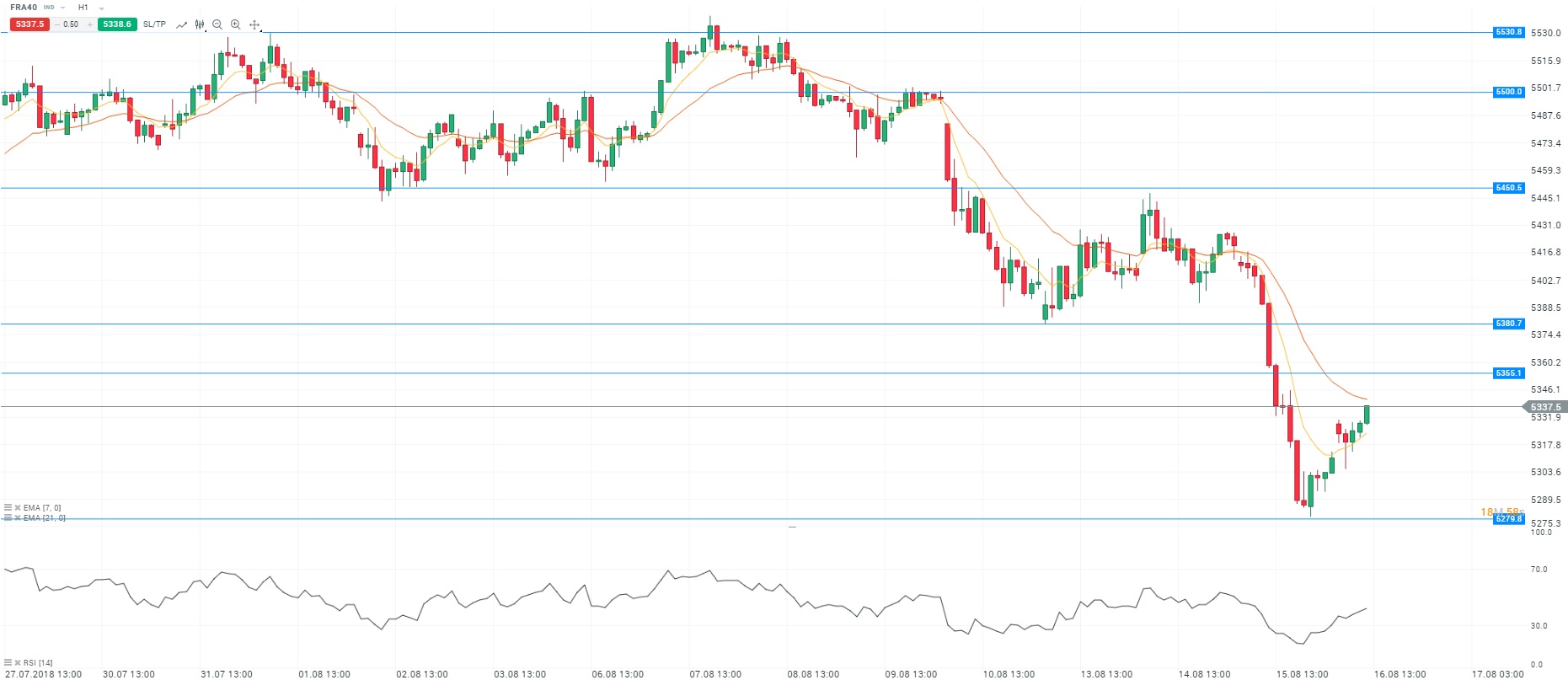 Une réunion est prévue entre la Chine et les Etats-Unis à la fin du mois sur le Commerce. En effet, Wang Shouwen, vice-ministre chinois du Commerce, doit se rendre aux Etats-Unis pour y rencontrer David Malpass, sous-secrétaire américain au Trésor en charge des affaires internationales. L’annonce de cette réunion permet aux matières premières de retrouver des couleurs. Du côté des valeurs, Vinci est pénalisé par la chute d’Atlantia, maison-mère de la société gestionnaire de l’autoroute A10 en Italie. Par ailleurs, TechnipFMC progresse après une recommandation à l’achat de Jefferies. Enfin, sur le marché des changes, la paire EURUSD continue d’évoluer sous le seuil de 1,14$. Concernant l’analyse technique, les cours fluctuent au-dessus de la moyenne mobile courte (à 7 périodes) en unité de temps horaire (H1). Le RSI est orienté à la hausse autour de sa zone de neutralité. Ces éléments nous conduisent à avoir une préférence à l’achat avec pour objectif le niveau des 5 355 points.