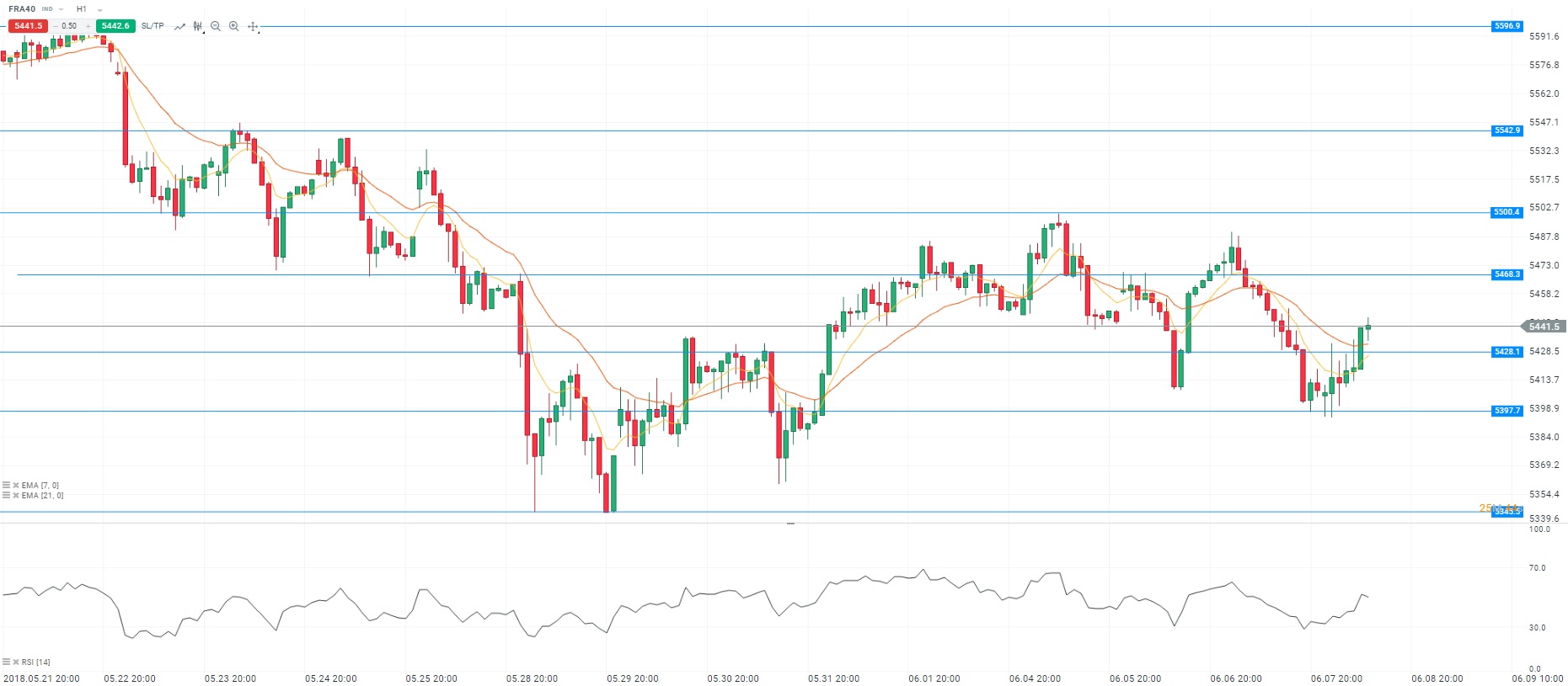 Pour l’heure, la Bourse de Paris est orientée à la baisse en raison des inquiétudes entourant le sommet du G7. Les hostilités ont déjà commencé par médias interposés. En effet, Justin Trudeau et Emmanuel Macron sont les cibles d’un nouveau tweet de Donald Trump. Ce dernier est déterminé et ne fera aucune concession. Par ailleurs, nous faisons état d’une contraction de la production industrielle en France pour le mois d’avril. Du côté des valeurs, ArcelorMittal recule en raison de la baisse des cours des métaux de base. Enfin, on constate une baisse des rendements obligataires. Concernant l’analyse technique, les cours fluctuent au-dessus de la moyenne mobile courte (à 7 périodes) en unité de temps horaire (H1). Le RSI est orienté à la hausse autour de sa zone de neutralité. Ces éléments nous conduisent à avoir une préférence à l’achat avec pour objectif le niveau des 5 468 points.