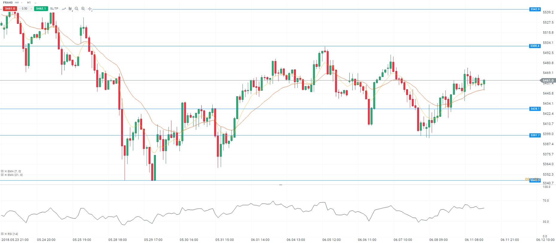 Pour l’heure, les indices européens saluent le biais accommodant adopté par Giovanni Tria, le ministre de l’Economie italien. Ce dernier a affirmé que le gouvernement italien est « clair et unanime » concernant le maintien de son pays dans la zone euro. Par conséquent, le rendement de l’obligation italienne de maturité dix ans s’est replié sur le niveau des 2,86%. Ainsi, les valeurs bancaires se distinguent à l’image de Société Générale, Crédit agricole et BNP Paribas. A l’opposé, le secteur automobile est pénalisé par la menace de droits de douane américains sur les automobiles européennes. Sur le marché des changes, la paire EURUSD évolue autour du niveau de 1,18 dollar. Concernant l’analyse technique, les cours fluctuent au-dessus de la moyenne mobile courte (à 7 périodes) en unité de temps horaire (H1). Le RSI est stable proche de sa zone de surachat. Ces éléments nous conduisent à avoir une préférence à l’achat avec pour objectif le niveau des 5 500 points.