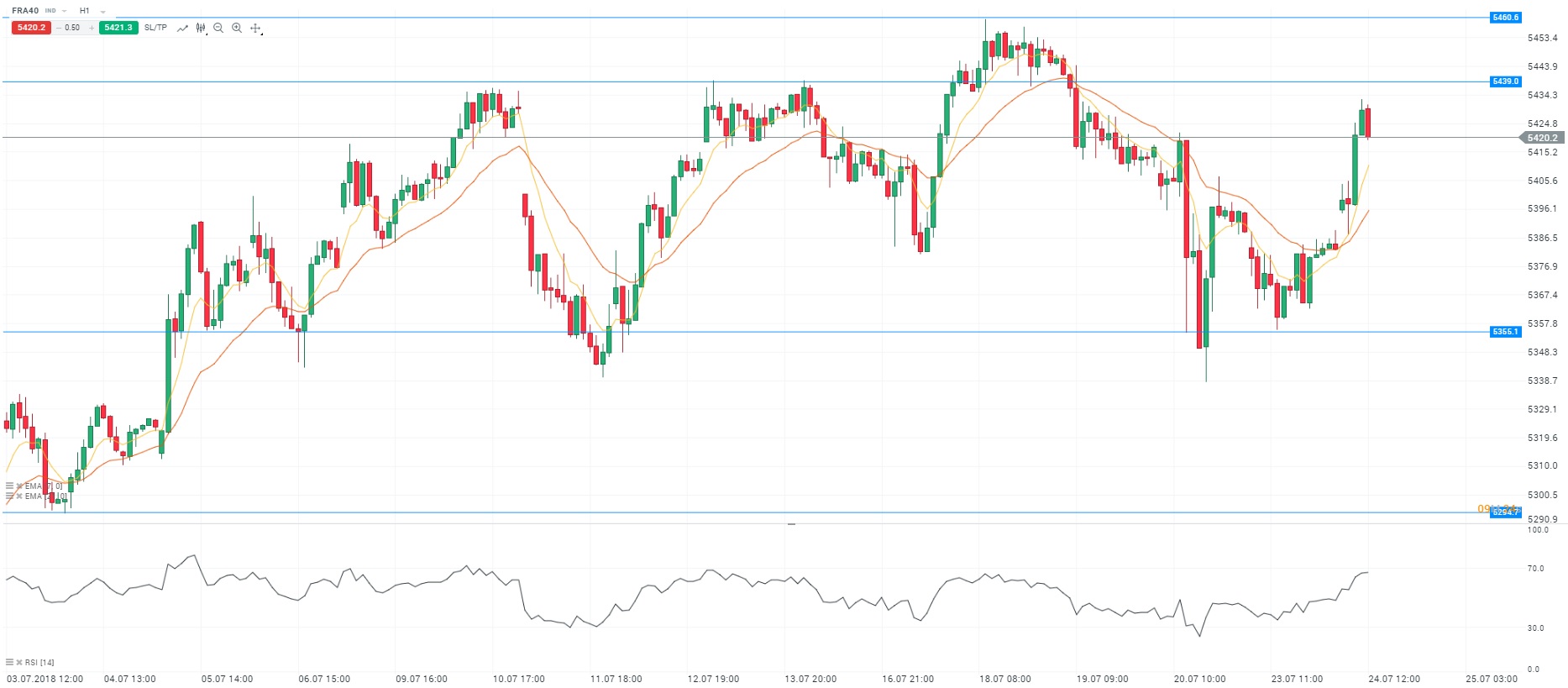 La séance est marquée par la publication des indices PMI d’activité en Europe. En France, la composante pour le secteur manufacturier est ressorti supérieur aux attentes du consensus. Cependant, on constate un ralentissement de l’activité dans le secteur privé avec les services. La tendance est similaire pour la zone euro. En Allemagne, la croissance est soutenue par le secteur manufacturier. Du côté des valeurs, PSA progresse suite à la publication de ses résultats trimestriels. Le groupe automobile a fait état d’une marge opérationnelle record. Après la clôture, nous prendrons connaissance des résultats de LVMH. Sur le marché des changes, la paire EURUSD se stabilise au-dessus du seuil de 1,17$ pour un euro. Sur un plan technique, les cours oscillent au-dessus de la moyenne mobile courte (à 7 périodes) en unité de temps horaire (H1). Le RSI est orienté à la hausse vers sa zone de surachat. Pour conclure, nous sommes acheteurs avec comme objectif le niveau des 5 439 points.