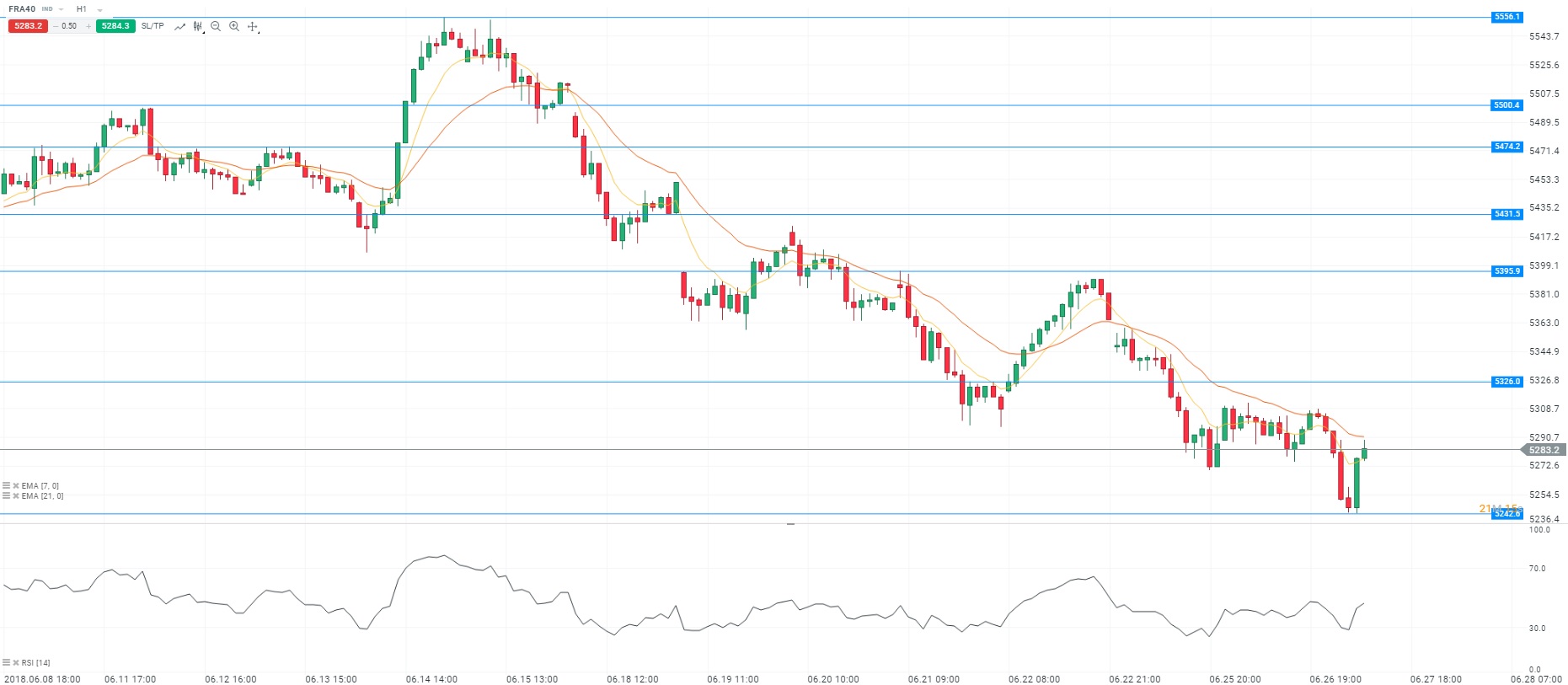 Malgré le biais accommodant adopté par Donald Trump, la prudence reste de mise sur les marchés. Et pour cause, le représentant américain au Commerce, Robert Lighthizer a déclaré : « face aux taxes injustifiées, les Etats-Unis engageront les actions nécessaires conformément aux lois américaines et internationales pour protéger ses intérêts ». Seule la hausse des cours du pétrole pourrait soutenir les indices. En effet, TechnipFMC et Total progressent. Du côté des valeurs, le secteur automobile reste pénalisé par la menace de droits de douane américains sur les importations de véhicules européens. Sur le marché des changes, l’euro cède du terrain face au dollar et la paire EURUSD évolue sur le niveau de 1,1638 dollar pour un euro. Concernant l’analyse technique, les cours fluctuent au-dessus de la moyenne mobile courte (à 7 périodes) en unité de temps horaire (H1). Le RSI est orienté à la hausse autour de la zone de neutralité. Ces éléments nous conduisent à avoir une préférence à l’achat avec pour objectif le niveau des 5 326 points.