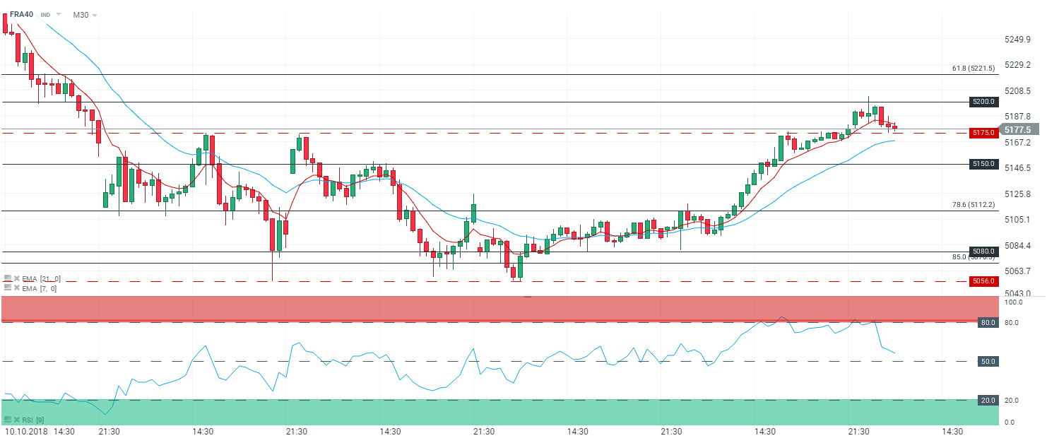 En 30 minutes (M30), l’indice français (FRA40) évolue en tendance haussière. Les cours se sont extirpés de leurs zone de range en s’affranchissant ce matin des 5 175 points. Les prix sont portés par la moyenne mobile à 21 périodes. De son côté le RSI est orienté à la baisse proche de sa zone de neutralité et oscille à 55,4 points.