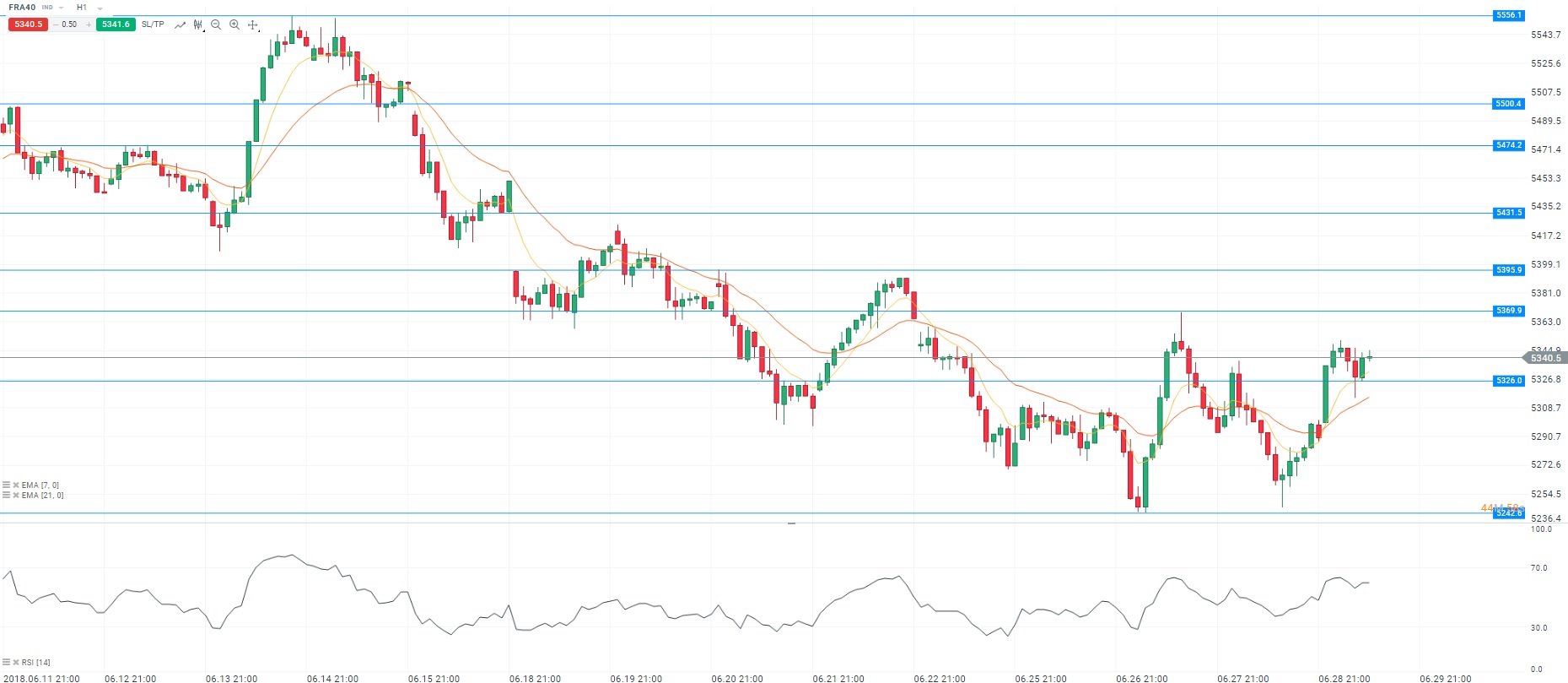 Les Bourses européennes retrouvent des couleurs dans le sillage de leurs homologues chinoises. En effet, la Banque centrale chinoise a annoncé qu’elle maintiendrait la liquidité à un niveau « raisonnablement ample ». Du côté des statistiques, l’Insee a publié la première estimation d’inflation du mois juin en France. L’indice des prix à la consommation a progressé de 2,1% en rythme annuel sur cette période, porté par la hausse des cours du pétrole. L’inflation dépasse donc la cible fixée par la Banque centrale européenne (BCE). En ce qui concerne les valeurs, les secteurs bancaire et technologique affichent des performances positives à l’image de BNP Paribas et STMicroelectronics. Concernant l’analyse technique, les cours fluctuent au-dessus de la moyenne mobile courte (à 7 périodes) en unité de temps horaire (H1). Le RSI est orienté à la hausse vers sa zone de surachat. Ces éléments nous conduisent à avoir une préférence à l’achat avec pour objectif le niveau des 5 369 points.