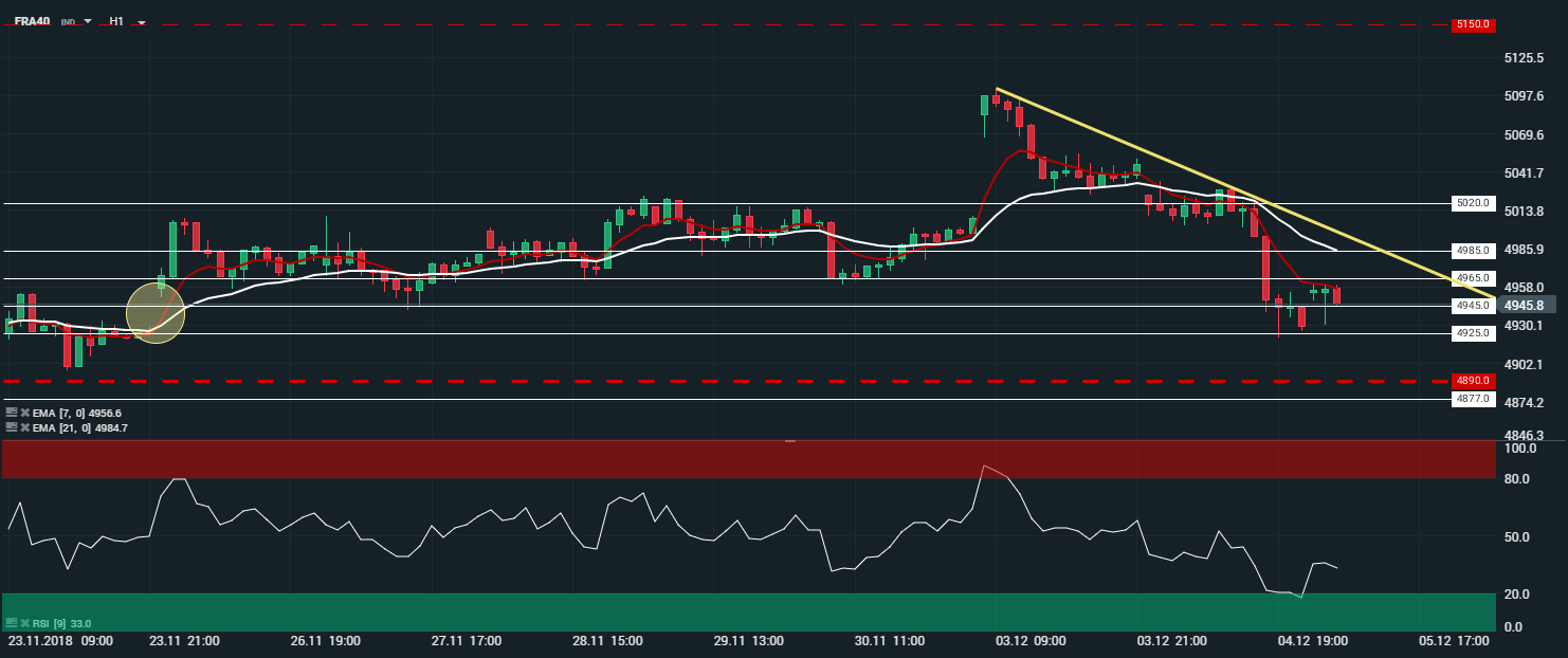 En unité de temps 1 heure (H1) l’indice français (FRA40) évolue en tendance baissière. Les cours sont capés par les moyennes mobiles à 7 et 21 périodes. Le RSI est orienté à la baisse proche de sa zone de « sur vente » et oscille à 33 points. Les cours ont retrouvé leur support sur le niveau des 4 925 points et ont ainsi comblé le gap formé du 26 novembre 2018. Dans ce contexte, nous serons haussiers sur l’indice, avec comme objectif le niveau des 4 965 points.