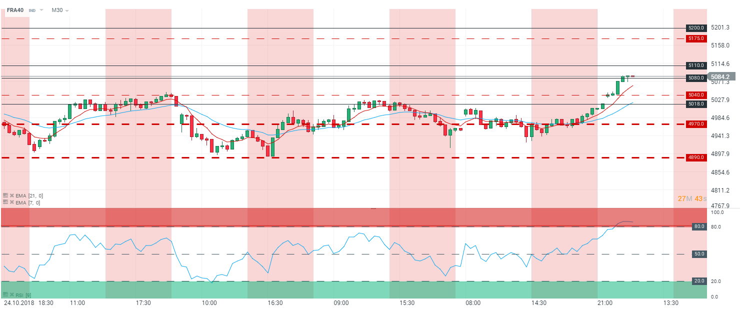En 30 minutes (M30), l’indice CAC 40 (FRA40), s’inscrit en forte hausse gagnant plus de 2,10 % à 5 080 points. Les cours se sont donc affranchis du niveau des 5 040 points - correspondant à la borne haute du range. Les prix sont portés par les moyennes mobiles à 7 et 21 périodes. Le RSI oscille à 84,7 points et tend à s’aplatir dans sa zone de « sur achat ». Dans ce contexte, nous serons haussiers sur l’indice, avec en ligne de mire le niveau des 5 100 points.