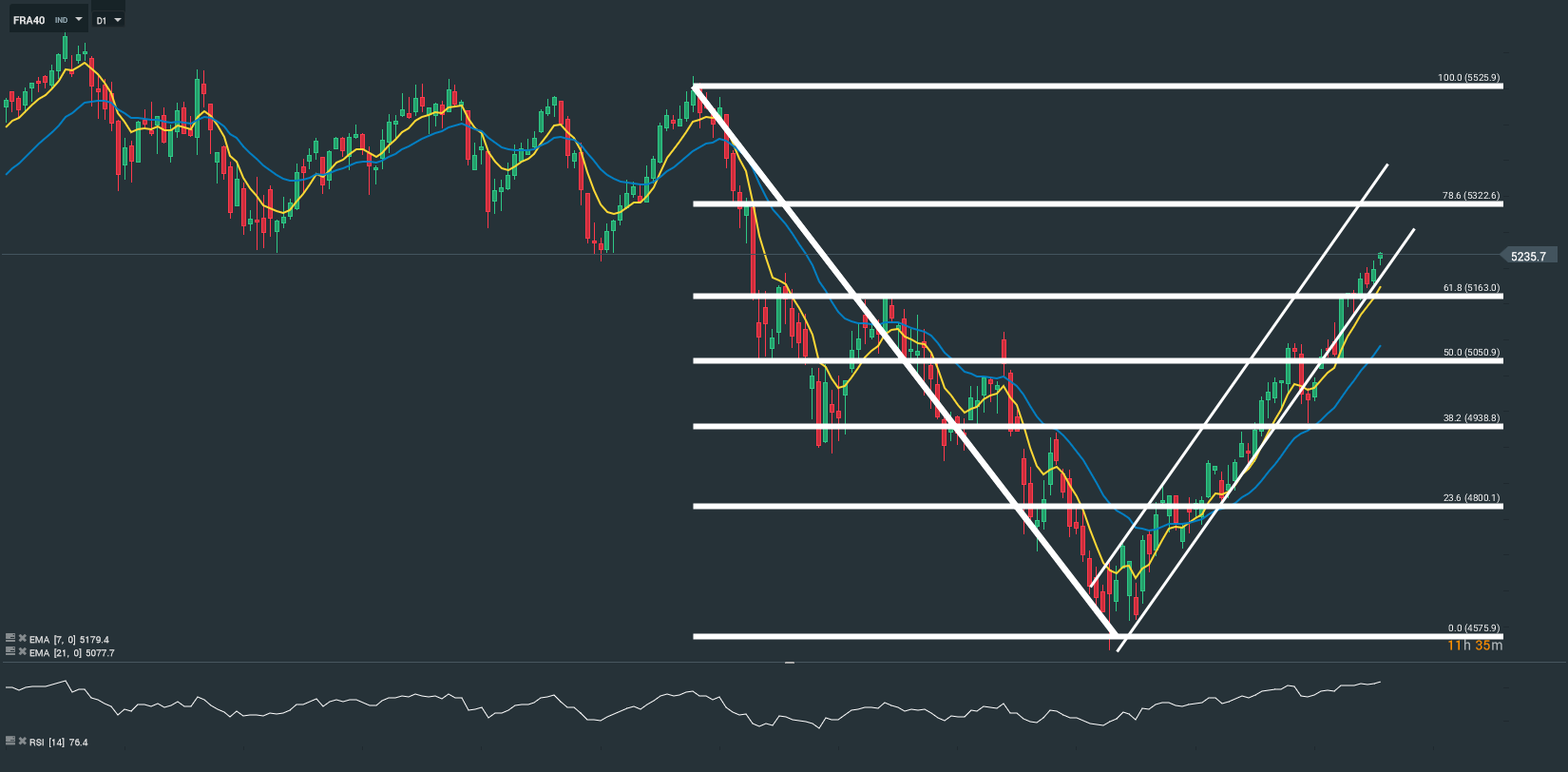 Sur le plan technique, en analyse journalière (D1), le CAC40 a retrouvé les niveaux d’octobre 2018. Les cours évoluent, depuis le début de l’année dans un canal ascendant. Les moyennes mobiles de court terme (7 et 21 périodes) soutiennent l’indice. La semaine dernière, le seuil des 61,8% des retracements de Fibonacci a été franchi (au niveau des 5 163 points). Le RSI est orienté à la hausse, et oscille dans sa zone de « surachat ». Pour conclure, nous avons un biais haussier, à court terme, sur l’indice parisien.
