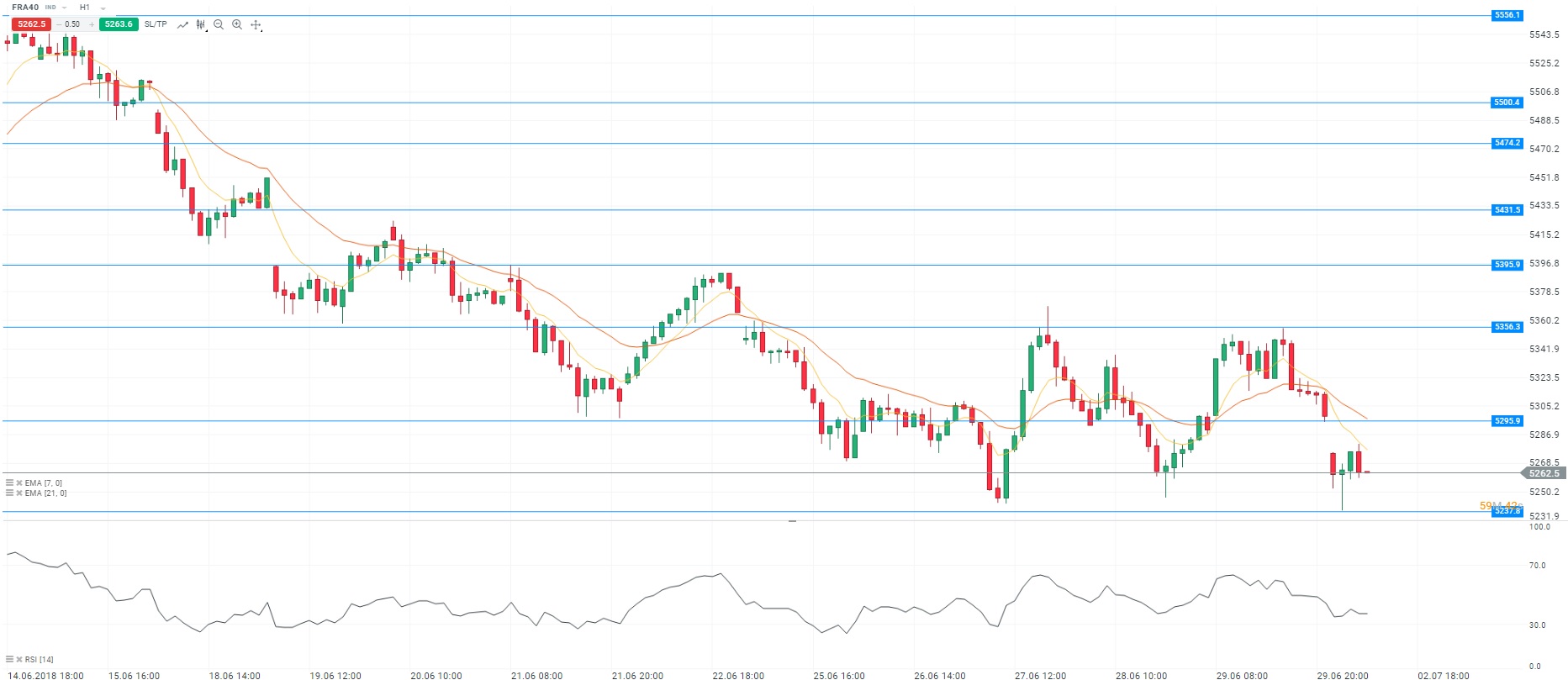 L’Europe passe à l’offensive sur le dossier commercial. En effet, la Commission européenne songerait à imposer de nouveaux droits de douane portant sur 300 milliards de dollars de produits américains. Pour rappel, l’administration américaine devrait officialiser vendredi la mise en place des mesures tarifaires ciblant 34 milliards de dollars d’importations chinoises. Sur le plan politique, la situation est instable du côté de l’Allemagne en raison des divergences au sein de la coalition sur la question migratoire. Dans le même temps, nous avons pris connaissance de l’indice PMI manufacturier du mois de juin en France. Selon IHS Markit, le secteur manufacturier a ralenti sur cette période avec un indicateur au niveau des 52,5, contre 53,1 en prévision. Concernant l’analyse technique, les cours fluctuent sous les moyennes mobiles (à 7 et 21 périodes) en unité de temps horaire (H1). Le RSI est orienté à la hausse autour de sa zone de neutralité. Ces éléments nous conduisent à avoir une préférence à la vente avec pour objectif le niveau des 5 242 points.