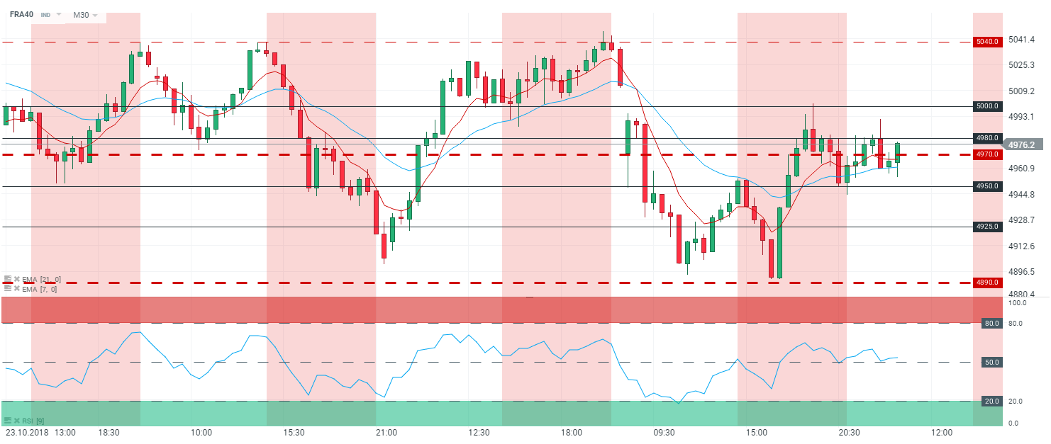 En 30 minutes (M30), l’indice français (FRA40), évolue en tendance baissière au sein de sa zone de range comprise entre 5 040 et 4 890 points. Pour l’heure les cours évoluent sous le niveau des 4 970 points. Les cours sont portés par les moyennes mobiles à 7 et 21 périodes. Le RSI évolue sur sa zone de neutralité et oscille à 52,5 points. Dans ce contexte, nous avons un biais baissier sur l’indice, avec en ligne de mire le niveau des 4 950 points et par extension le niveau des 4 925 points.