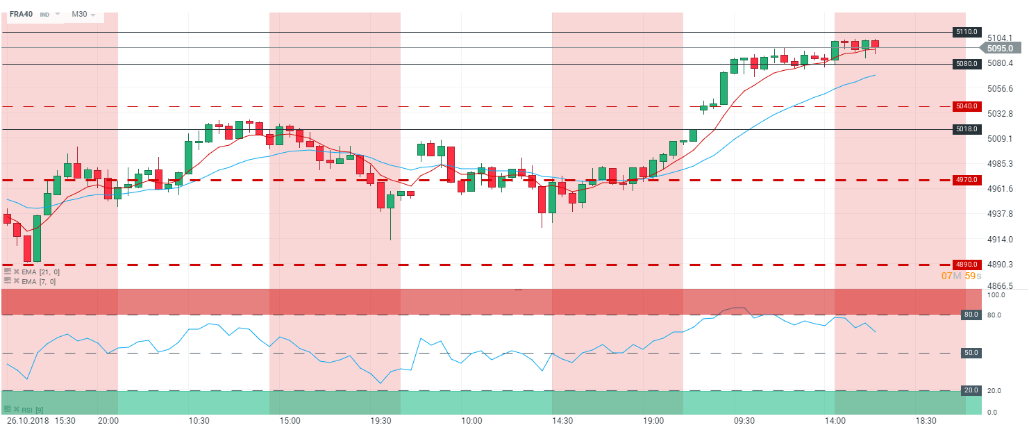 En 30 minutes (M30), l’indice français (FRA40) fluctue autour des 5 100 points. L’indice a fortement progressé tout au long de la séance, gagnant plus de 2,45 %. L’objectif fixé à 5 100 points a était atteint grâce aux flux américains. Les cours sont toujours portés par les moyennes mobiles à 7 et 21 périodes. Le RSI est orienté à la baisse et oscille à 65,7 points. Dans ce contexte, nous avons un biais neutre.