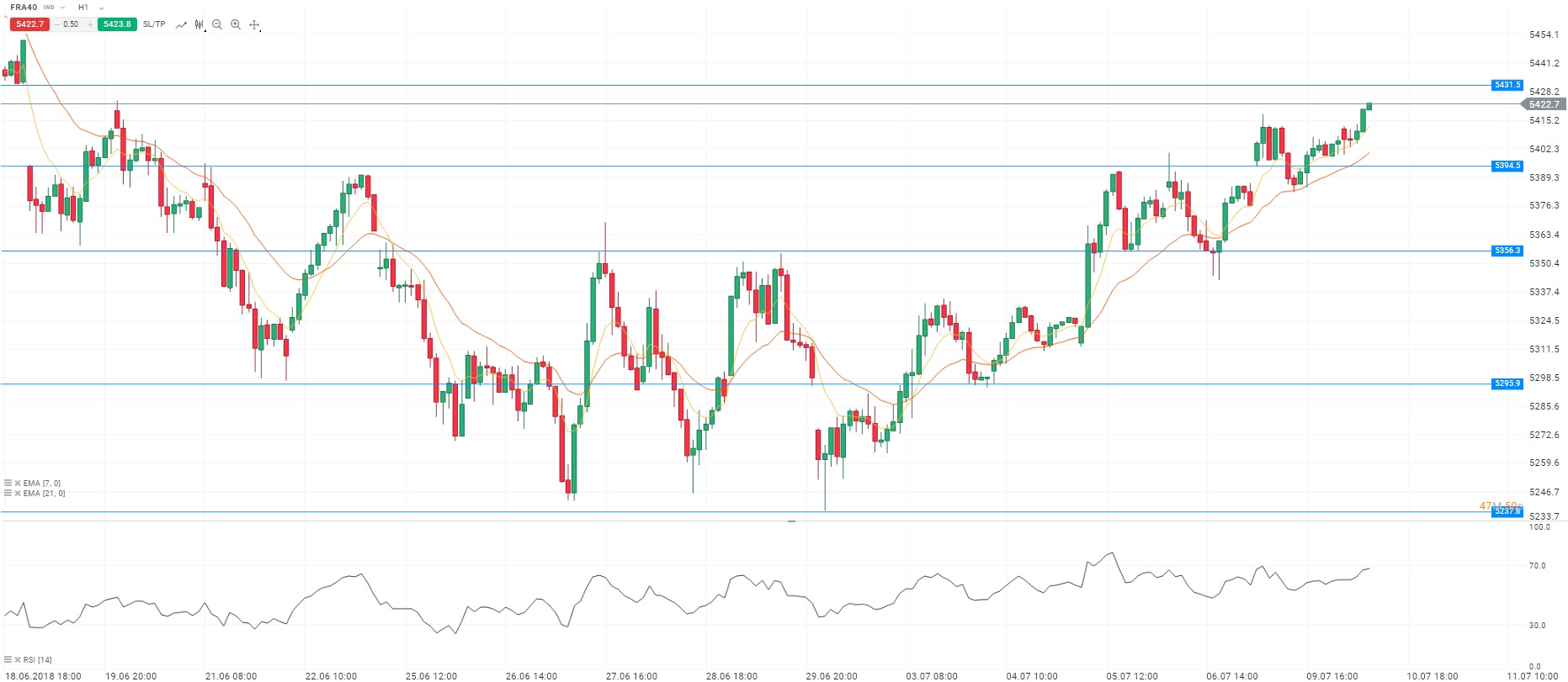 Nous avons pris connaissance des chiffres de la production industrielle du mois de mai en France. Selon l’Insee, l’activité industrielle s’est contractée de 0,2% sur cette période alors que le consensus anticipait une hausse de 0,7%. La tendance est similaire pour le secteur manufacturier. Du côté des valeurs, la hausse des cours du pétrole est bénéfique à Total et TechnipFMC. Par ailleurs, la valeur Renault stagne après avoir été pénalisée par Nissan lundi. Concernant l’analyse technique, les cours fluctuent au-dessus des moyennes mobiles (à 7 et 21 périodes) en unité de temps horaire (H1). Le RSI est orienté à la hausse vers sa zone de surachat. Ces éléments nous conduisent à avoir une préférence à l’achat avec pour objectif le niveau des 5 431 points.