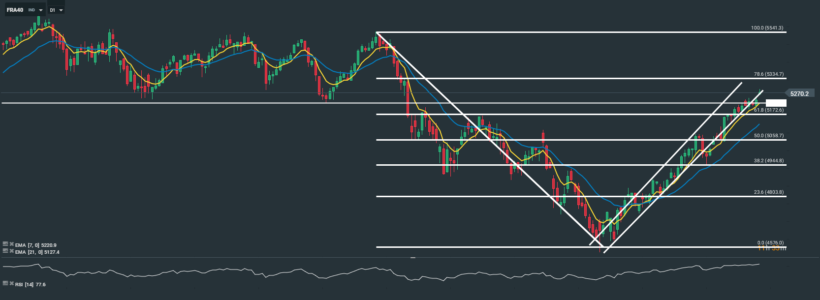 Sur le plan technique, en horizon temporel journalier (D1), l'indice s'est affrranchi d'une zone de résistance majeure (niveau des 5 240 points), et navigue autour des 5 270 points (+0,64%). Les prix, par manque de "catalyseurs" ont pendant plusieurs jours fluctué sous les 5 240 points. Le gap haussier formé en séance, témoigne d'un enthousiasme des investisseurs. Les cours sont soutenus par les moyennes mobile à 7 et 21 périodes. le RSI évolue juste en-deça de sa zone de "surachat" (77,8). Pour l'heure, nous avons un biais haussier, à court terme, sur le CAC40.