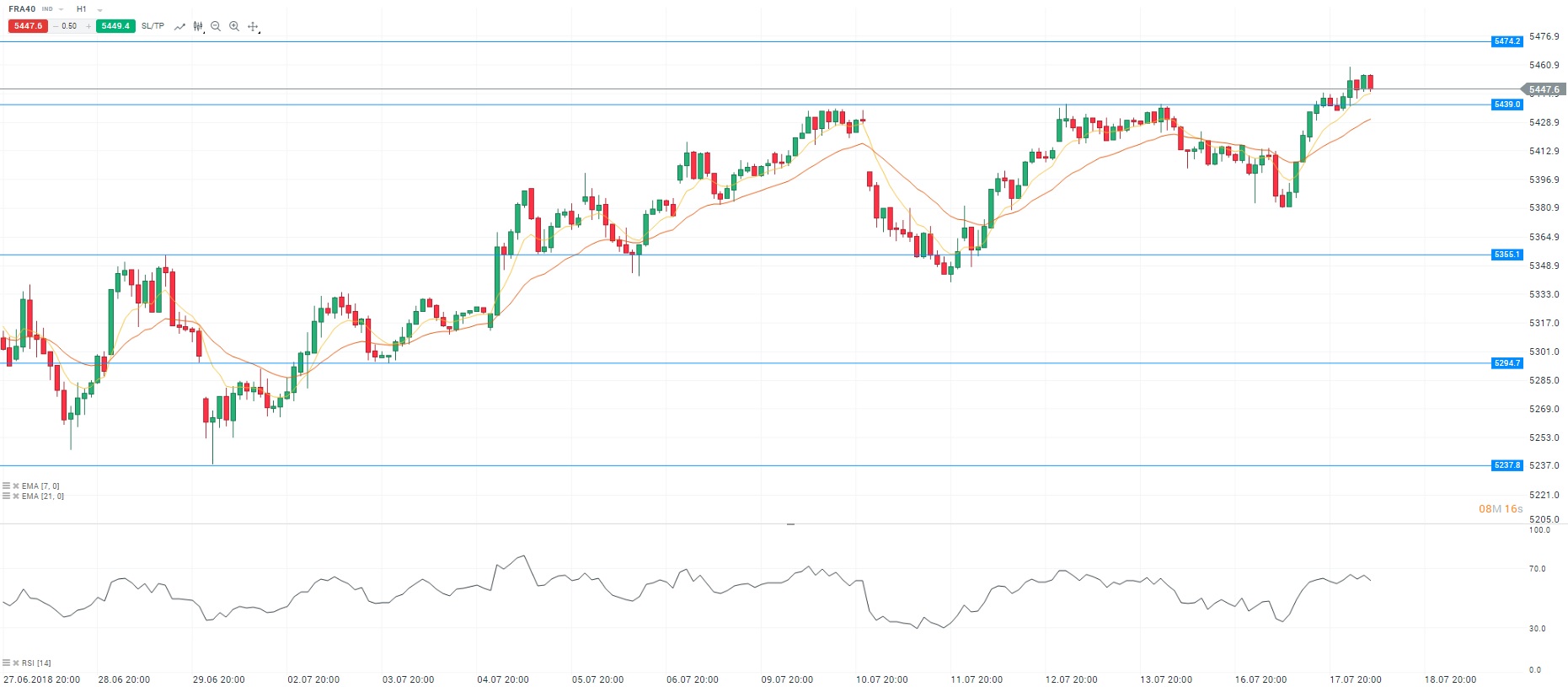 Pour l’heure, les indices européens évoluent en territoire positif grâce à la publication de bons résultats trimestriels notamment du côté des valeurs technologiques. Par ailleurs, les valeurs automobiles gagnent du terrain en vue de la prochaine visite de Jean-Claude Juncker, président de la Commission européenne, le 25 juillet à Washington. Ce dernier tentera de dissuader Donald Trump de ne pas imposer des droits de douane sur les importations de véhicules européens. De plus, les propos optimistes de Jerome Powell, président de la Réserve fédérale (Fed), sur les perspectives économiques aux Etats-Unis continuent de soutenir les cours. Du côté des valeurs, STMicroelectronics progresse en raison des bons résultats trimestriels publiés par Texas Instruments. En outre, Arcelor Mittal profite d’une recommandation de JPMorgan. Sur un plan technique, les cours oscillent au-dessus de la moyenne mobile courte (à 7 périodes) en unité de temps horaire (H1). Le RSI est orienté à la hausse vers sa zone de surachat. Pour conclure, nous sommes acheteurs avec comme objectif le niveau des 5 474 points.