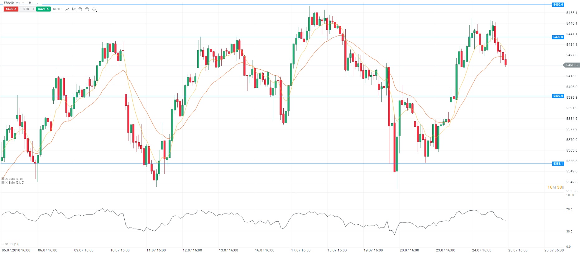 Pour l’heure, les indices européens évoluent en territoire négatif. En effet, la prudence est de mise avant la réunion entre Jean-Claude Juncker, président de la Commission européenne, et Donald Trump, président des Etats-Unis, sur le commerce. Les discussions porteront surtout sur le secteur automobile. Pour rappel, le président américain a menacé d’imposer des droits de douane de 25% sur les véhicules européens importés aux Etats-Unis. Du côté des valeurs, le secteur automobile recule tandis que LVMH bénéficie de ses bons résultats trimestriels. Kering, autre valeur du secteur du luxe est porté par ces publications. Sur le marché des changes, la paire EURUSD évolue au-dessus du seuil de 1,17$. Enfin, nous prendrons connaissance demain de la décision de politique monétaire de la Banque centrale européenne (BCE). D’un point de vue technique, les cours évoluent sous les moyennes mobiles (à 7 et 21 périodes) en unité de temps horaire (H1). Le RSI est orienté à la baisse dans sa zone de neutralité. En conclusion, nous avons un biais vendeur avec comme objectif le niveau des 5 400 points.