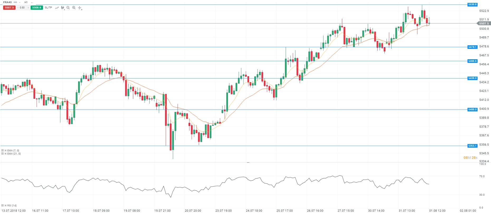 Les indices européens évoluent actuellement en baisse en raison du retour des tensions commerciales. Mardi, les Bourses européennes ont profité des informations de Bloomberg selon lesquelles la Chine et les Etats-Unis souhaiteraient reprendre les discussions afin d’éviter une guerre commerciale. Or, l’administration américaine voudrait imposer des droits de douane de 25% (et non plus 10%) sur 200 milliards de dollars de produits importés de Chine. Du côté des valeurs, BNP Paribas a annoncé un produit net bancaire en hausse de plus de 2% tandis que le profit net stagne. Veolia perd près de 4% malgré des résultats supérieurs aux attentes. Enfin, Apple a rassuré les opérateurs en publiant des résultats trimestriels supérieurs aux prévisions. Concernant l’analyse technique, les cours fluctuent autour des moyennes mobiles (à 7 et 21 périodes) en unité de temps horaire (H1). Le RSI est orienté à la baisse autour de sa zone de neutralité. Ces éléments nous conduisent à avoir une préférence à la vente avec pour objectif le niveau des 5 478 points.