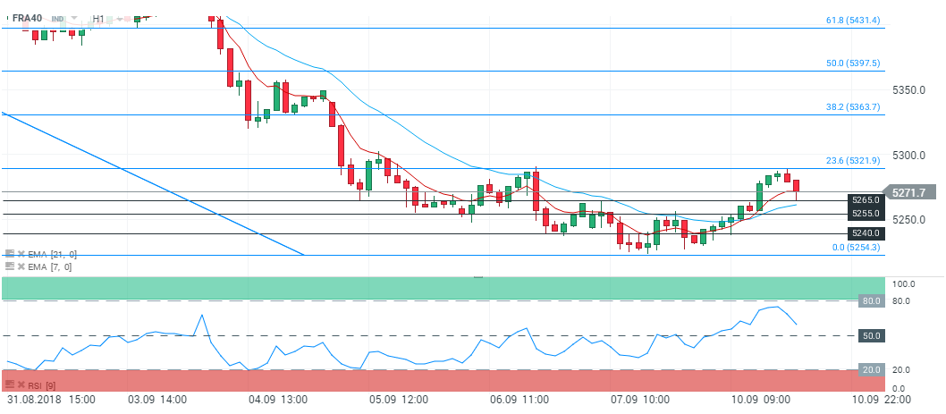 En unité de temps journalière (D1), le CAC40 (FRA40) a touché son plus bas depuis le mois d’avril à 5 244 points. Depuis, l’actif semble repartir à la hausse. En effet, sur la représentation graphique ci-dessus nous pouvons observer la formation d’un doji lors de la séance du 7 septembre. Doji qui traduit l’incertitude des opérateurs de marché sur ce niveau de prix. Ce dernier correspond à notre support et notre niveau des 0% des retracements des niveaux de Fibonnaci. A cela, il convient de noter que le RSI s’affranchit de sa zone de « survente » et oscille à présent autour des 31,3. Cependant, les prix restent capés par les moyennes mobiles à 7 et 21 périodes.