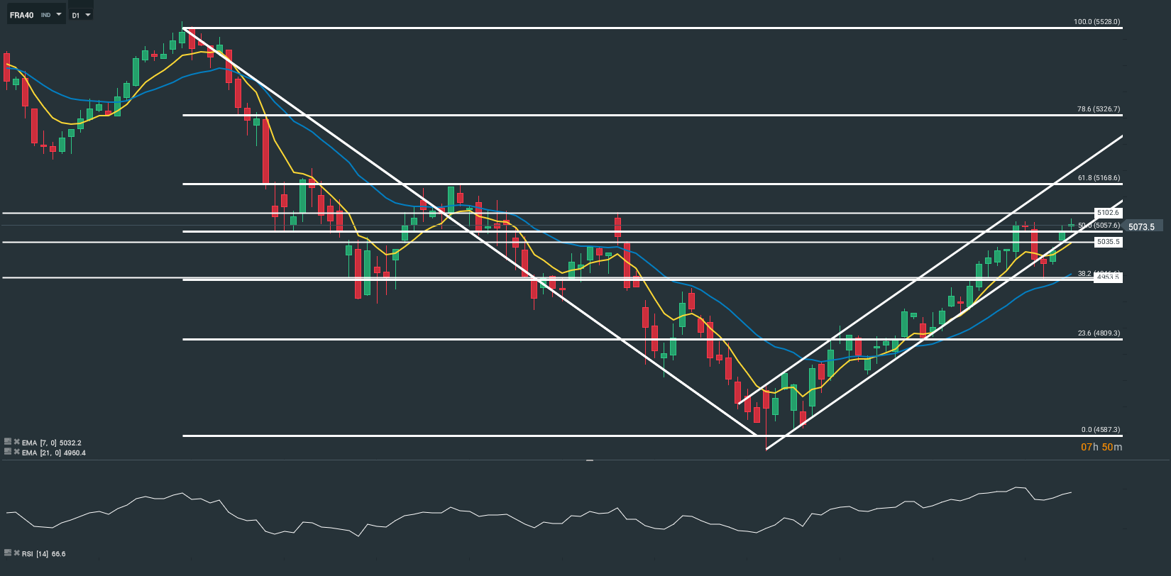 D’un point de vue technique, en horizon temporel journalier (D1), le Cac navigue sur le support d’un canal haussier. En effet, le RSI est orienté à la hausse (67,2), et les cours sont soutenus par les moyennes mobiles à 7 et 21 périodes. En conséquence, il est probable qu’à court terme l’indice parisien avoisine le niveau des 5 102 points. Néanmoins, si les cours s’affranchissent (à la baisse) de la trame de long terme, les prix pourraient atteindre les 5 035 points.