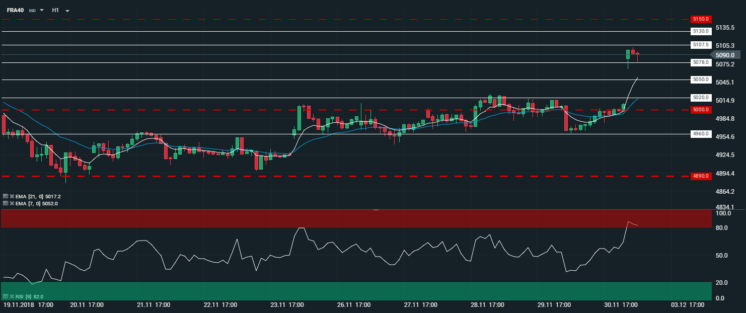 En unité horaire (H1), l’indice français (FRA40) évolue en tendance haussière. L’indice a ouvert en fort gap haussier, de plus de 75 point, s’affranchissant ainsi de sa zone de range. Les cours sont portés par les moyennes mobiles à 7 et 21 périodes. Le RSI est orienté à la baisse au sein de sa zone de « sur achat » et oscille à 80 points. Dans ce contexte, nous serons haussiers sur l’indice avec comme objectif le niveau des 5 107 points - et par extension le niveau des 5 130 points.