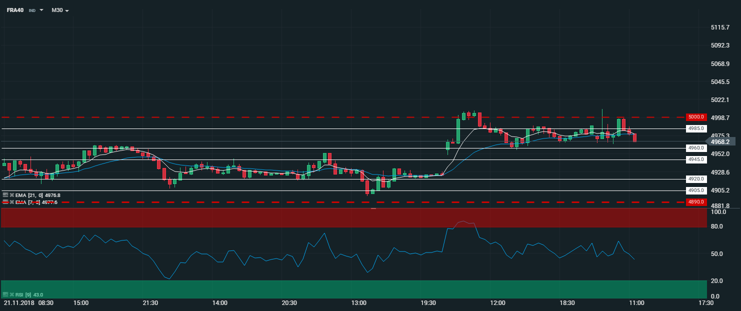 En unité de temps 30 minutes (M30), l’indice français (FRA40) évolue au sein de sa zone de range comprise entre 5 000 et 4 890 points. Les cours sont capés par les moyennes mobiles à 7 et 21 périodes. Le RSI est orienté à la baisse et oscille à 44,3 points. Dans ce contexte, nous avons un biais baissier sur l’indice français, avec comme objectif un retour sur les 4 960 points - et par extension les 4 945 points.