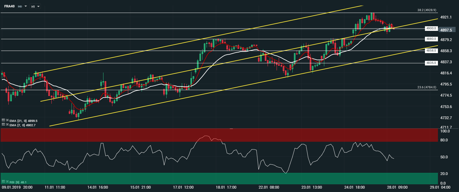 En unité de temps 1 heure (H1), l’indice CAC 40 (FRA40) poursuit son évolution au sein de son canal haussier. Les prix sont capés par les moyennes mobiles à 7 et 21 périodes. Le RSI est orienté à la baisse et oscille à 46,1 points. Dans ce contexte, nous serons baissier sur l’indice avec comme objectif le niveau des 4 880 points.