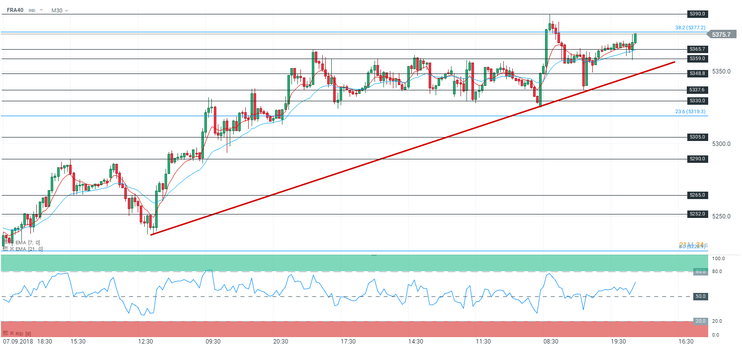 En unité de temps 30 minutes (M30), l’indice français évolue en tendance haussière et restent soutenu par les moyennes mobiles à 7 et 21 périodes. Les cours évoluent à présent au-dessus de la zone de support au niveau des 5 359 points – identifiée précédemment comme la borne haute du range où l’indice évoluait depuis 5 séances. Le RSI évolue dans sa zone de neutralité 59,2 points. Dans ce contexte nous avons un biais haussier sur l’indice, avec en ligne de mire le niveau des 5 390 points.