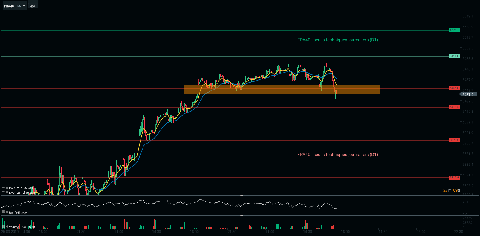 Sur un horizon M30 (« 30 minutes »), l’indice parisien s’est affranchi du seuil des 5 445 points. Nous assistons à une passe d’arme entre acheteurs et vendeurs autour de ce niveau technique. Pour l’heure, les cours ne sont pas parvenus à s’affranchir du gap haussier du 3 avril 2019. Nous remarquons que la forte correction se produit juste avant un évènement majeur, à savoir la conférence de presse de Mario Draghi. Pour l’heure, nous avons un biais neutre à court terme.