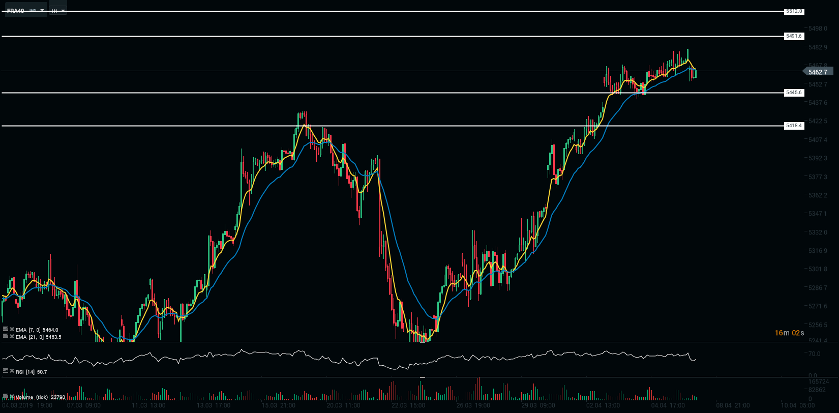 Sur le plan technique, en horizon horaire (H1), l’indice est entré dans une phase de consolidation. Les opérateurs surveillent de près la zone des 5 445-491 points. Le RSI est orienté à la hausse mais les moyennes mobiles à 7 et 21 périodes capent les cours. Pour l’heure, en attendant les données macroéconomiques américaines (16h) nous avons un biais neutre sur l’indice.