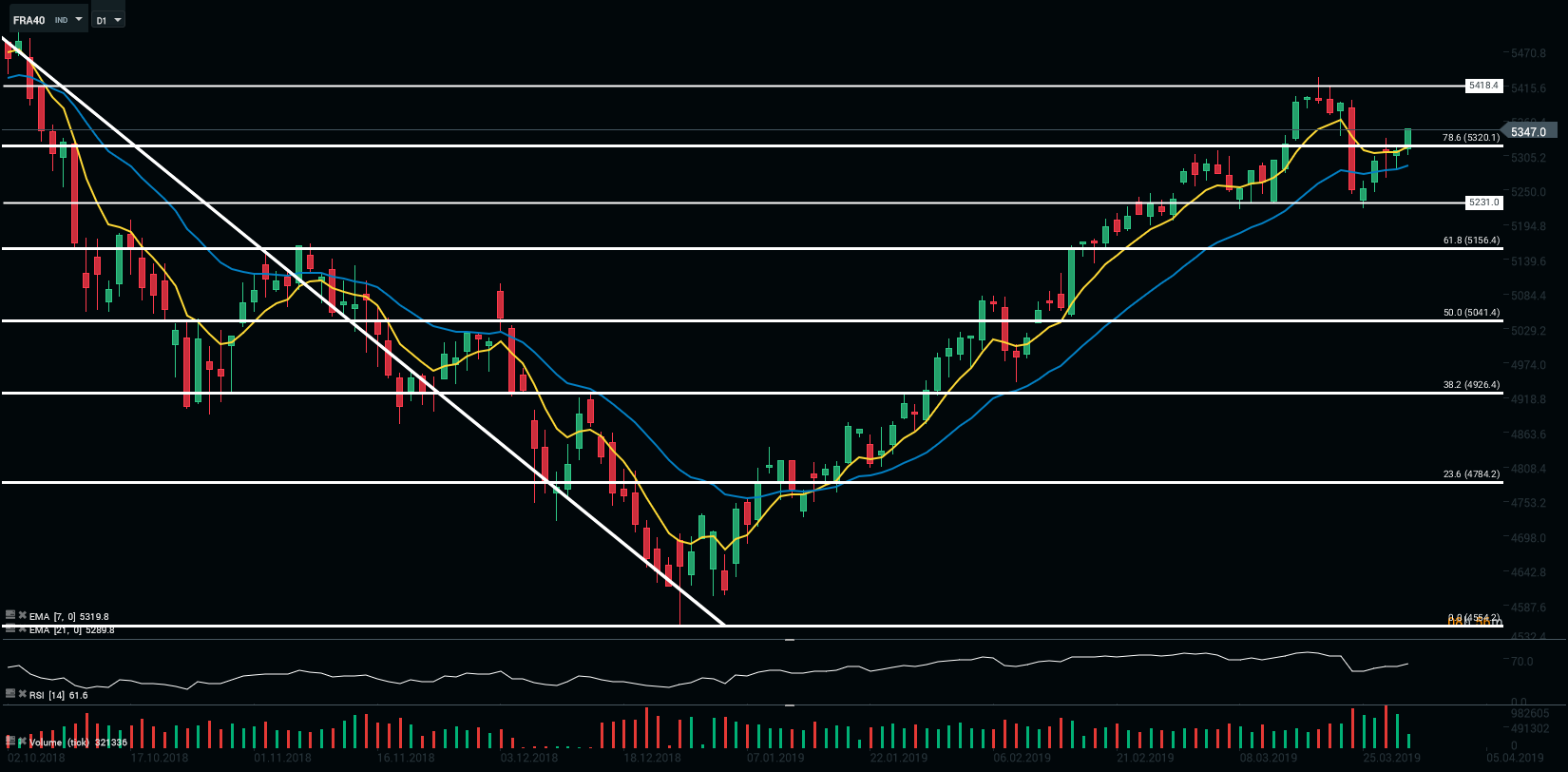 Sur le plan technique, en horizon journalier (D1), l’indice s’est affranchi de la zone des 78,6 % des retracements 5 320 points. Le RSI est orienté à la hausse et les moyennes mobiles soutiennent les cours. Dans l’attente de Westminster, nous avons un biais neutre.