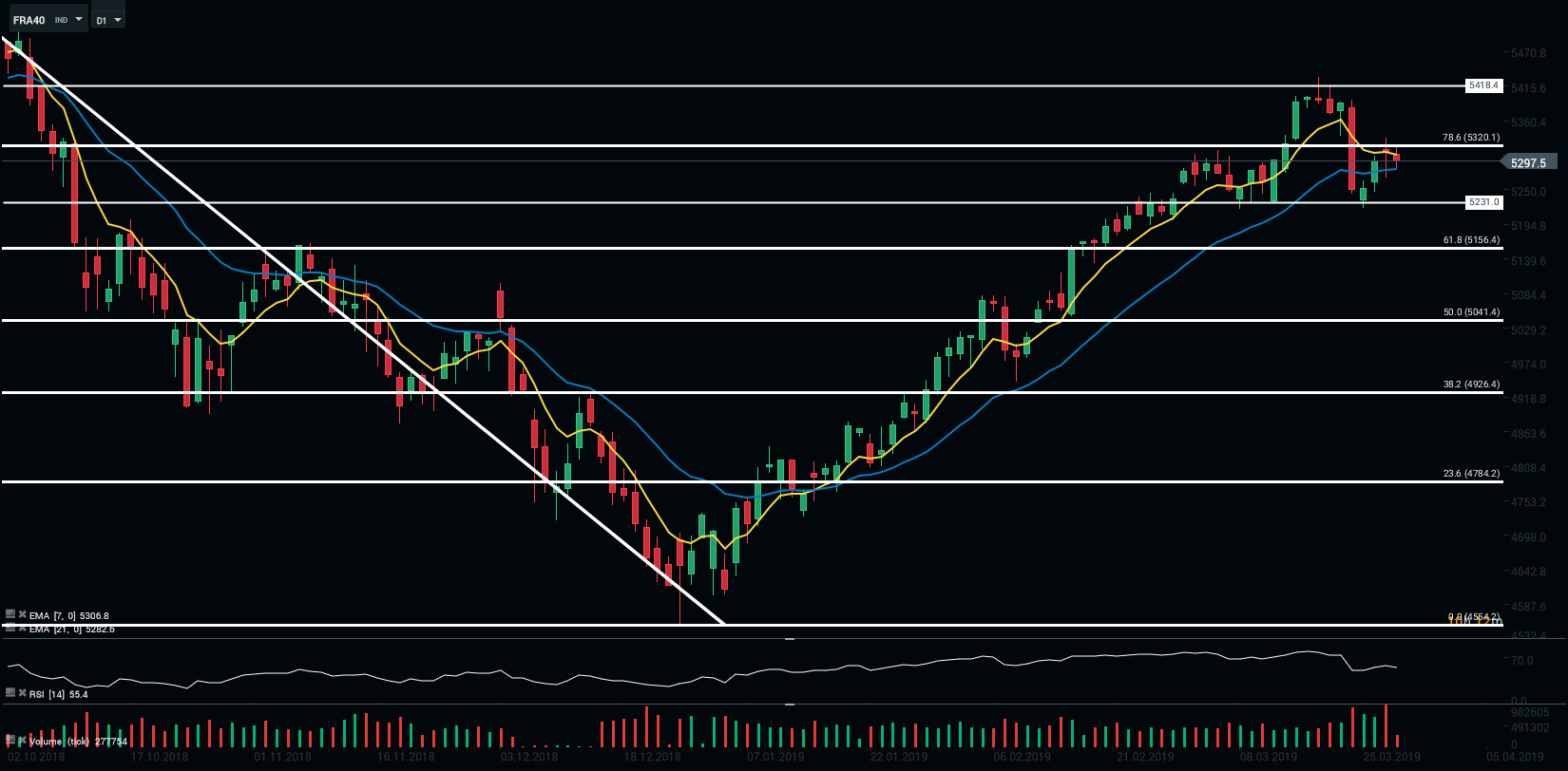 Sur le plan technique, l’indice parisien cède le terrain gagné en matinée. Les cours sont toujours capés par le seuil des 78,6 % des retracements de Fibonacci (5 320 points). La formation de l’« épaule-tête-épaule » semble se confirmer. Le RSI est orienté à la baisse. Nous avons un biais baissier sur l’indice.