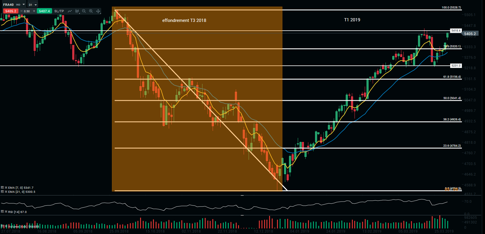 Sur le plan technique, en horizon temporel journalier (D1), l’indice a rallié la zone des 5 400 points. Les prix sont soutenus par les moyennes mobiles de court terme (7 et 21 périodes). Toutefois, le seuil des 5 400 points constitue un seuil psychologique majeur. Nous avons un biais neutre à court terme.