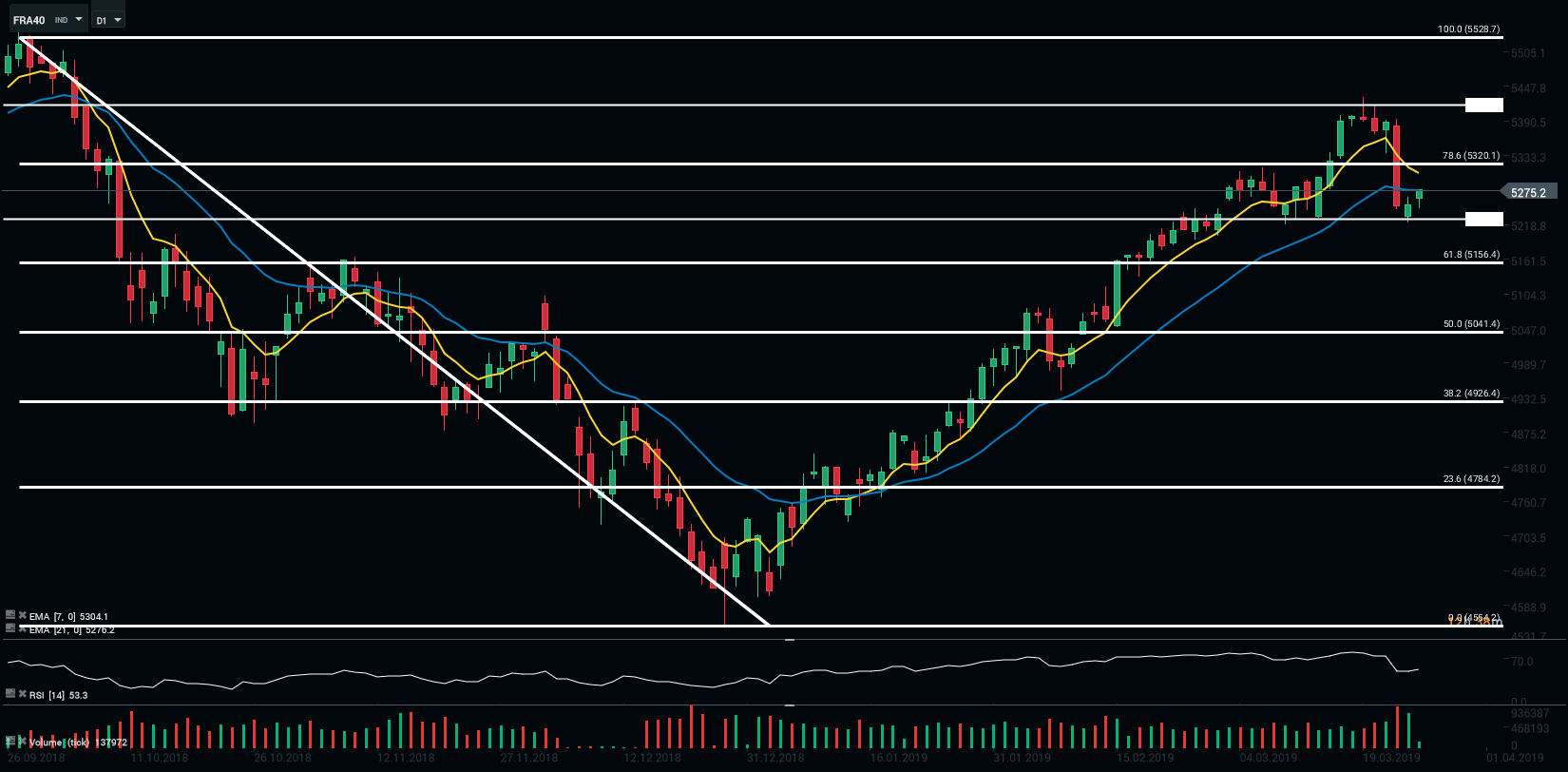 D’un point de vu chartiste, en horizon temporel journalier (D1), le CAC40 retrouve des couleurs. Apres la forte hausse de jeudi dernier et le coup de massue de vendredi, l’indice parisien navigue en territoire positif (+0,72 %, à 5 298 points). L’impulsion du 15 mars, la correction de vendredi et la consolidation d’hier nous pousse à anticiper la formation d’une « épaule tête épaule ». En effet, la chute de vendredi a été stoppée au niveau des 5 240 points (seuil psychologique majeur sur l’indice). Le CAC40 navigue de nouveau en territoire positif mais les cours sont capés par la zone des 5 320 points (correspondant au 78,6 % des retracements de Fibonacci) d’une part, et d’autre part par les moyennes mobiles à 7. Ainsi, nous avons un biais baissier à court terme.