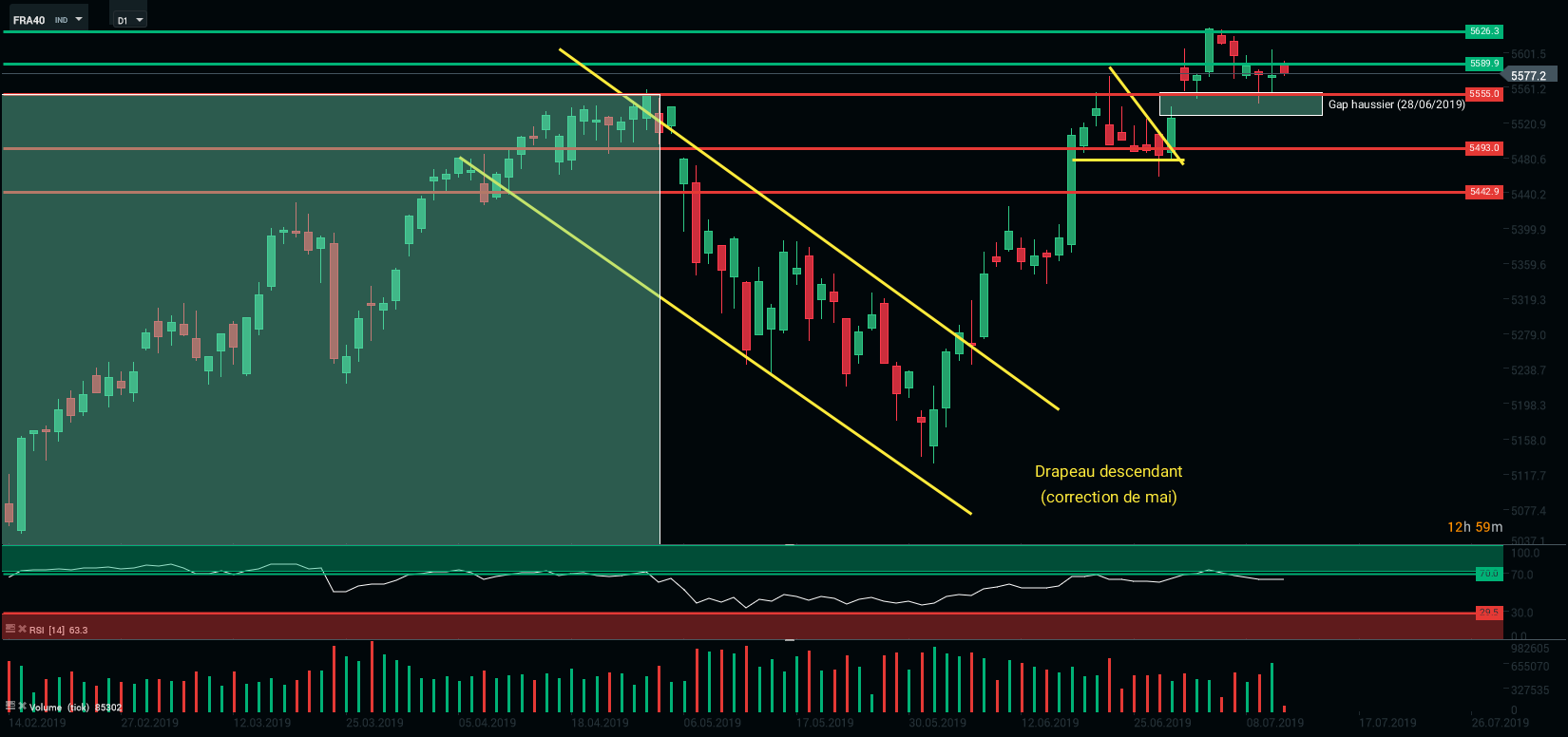 La Bourse de Paris retrouve des couleurs après un début de semaine en demi-teinte. Le CAC40 (FRA40) gagne 0,25 % à 5 580 points en séance. Portées par la flambée des prix du Brent, TechnipFMC et Total sont les valeurs qui portent l’indice. L’optimisme des investisseurs en ce qui concerne l’assouplissement monétaire en juillet et dans les mois à venir s’illustre par la hausse des indices européens, mais aussi par la sous performance des valeurs financières. Société générale BNP Paribas et Crédit Agricole figurent parmi les titres les moins performants de l’indice parisien.