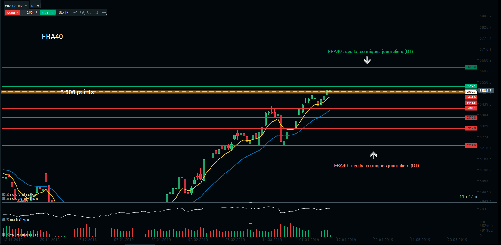 Sur un horizon journalier (D1), les 5 500 points cristallisent les attentions. Les marchés auront besoin de bonnes publications pour continuer leur élan haussier. Il est vrai que vendredi nous avons atteint un plus haut annuel. Pour l’heure, les haussiers ont pour objectif les 5 529 points dans un premier temps. En cas d’inversion de tendance, les opérateurs chercheront les 5 574 points. Nous avons un biais neutre sur l’indice à court terme.