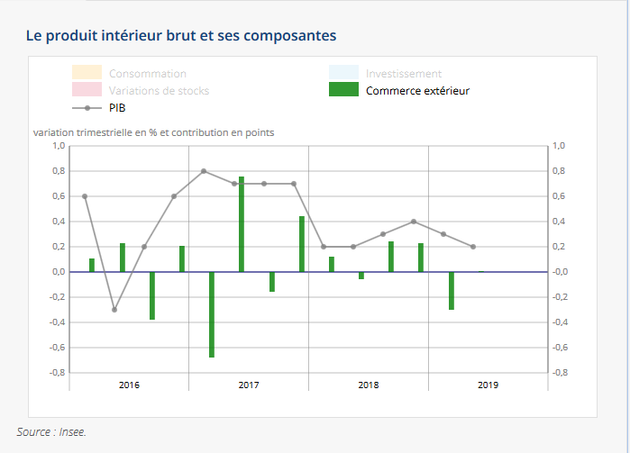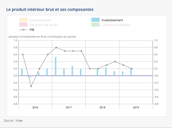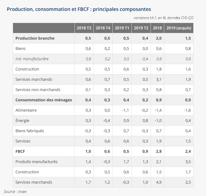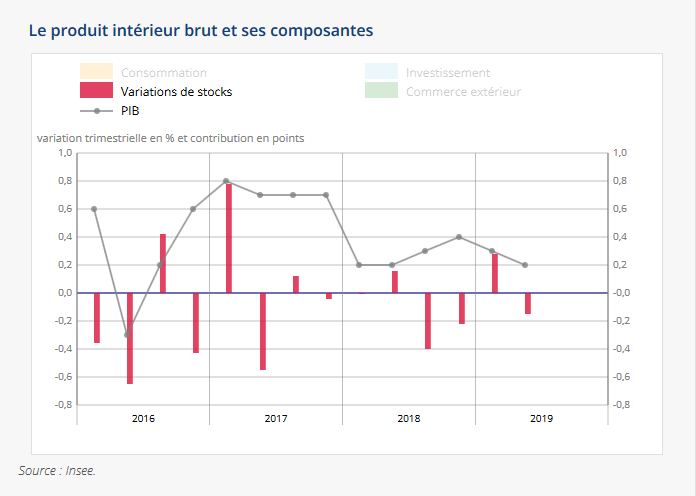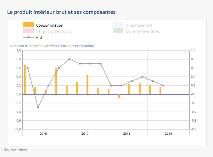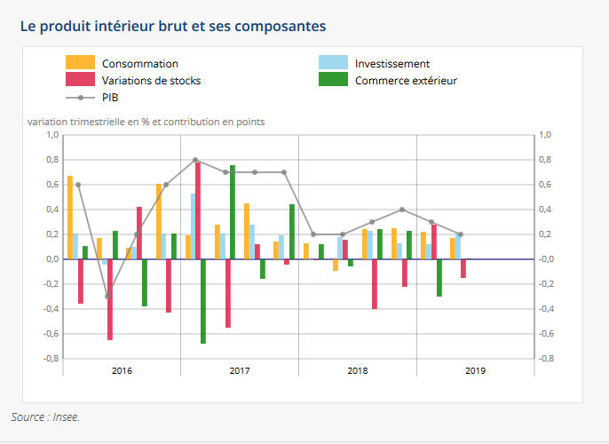 Malgré les mesures fiscales et budgétaires mis en œuvre par le gouvernement Macron en conséquences de la forte protestation sociale (mouvement des gilets jaunes), la croissance de l'économie française a ralenti au deuxième trimestre (T2) à + 0,2 %. La consommation des ménages et le déstockage des entreprises (variation de stock négative) expliquent en grande partie ces mauvais résultats. Le consensus tablait sur une hausse de 0,3% pour le deuxième trimestre. La dégradation du climat des affaires constatée à la fin du printemps dans le secteur de l’industrie a visiblement joué sur l’activité économique du T2.