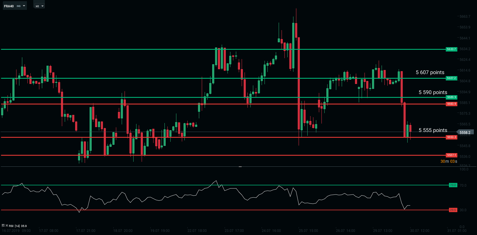 Nous constatons un recul de plus de 50 points de l’indice parisien. Après avoir navigué autour des 5 600 points lors de la dernière séance, l’indice parisien a connu une chute dès les premières minutes de cotation. La zone des 5 555 points joue encore une fois le rôle de support.