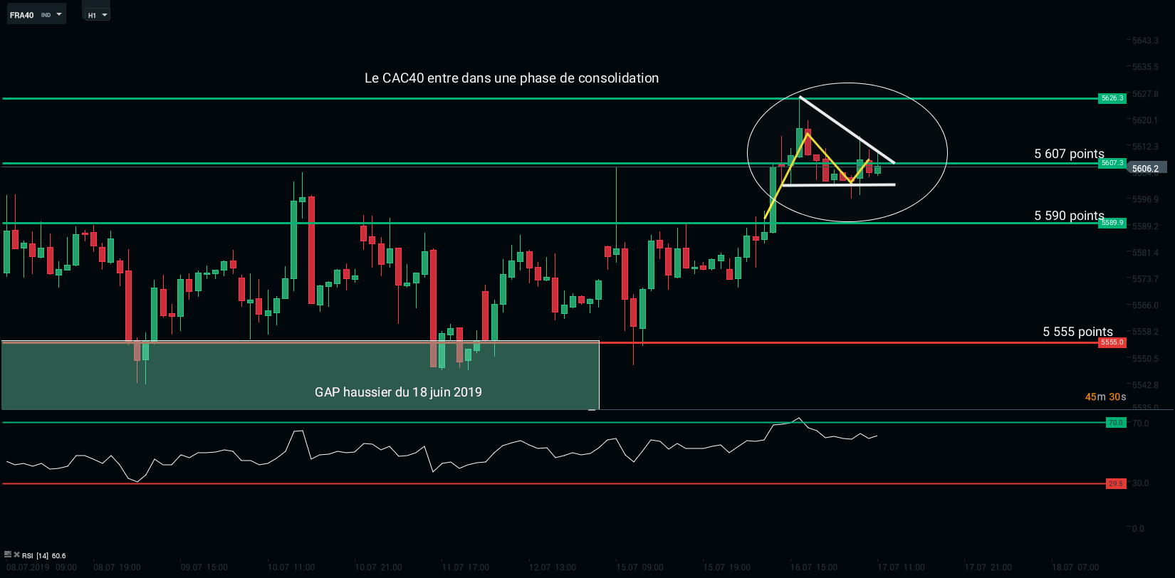 Les tensions commerciales pèsent sur les valeurs cycliques (valeurs corrélées à la conjoncture économique mondiale). En particulier, les titres liés aux matières premières comme ArcelorMittal, les pétrolières comme Total, et les parapétrolières comme TechnipFMC. Ces 3 valeurs sont en queue de peloton du CAC40. Sur le plan technique, nous remarquons que le CAC40 entre dans une phase de consolidation autour du seuil pivot des 5 607 points. Les prochaines échéances nous permettront de voir si la tendance sera haussière (sortie à la hausse du triangle blanc) ou baissière (sortie à la baisse).