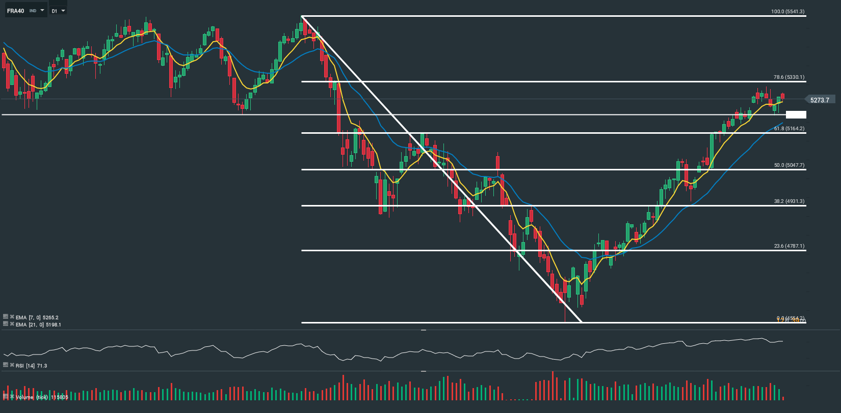 Sur le plan technique, en horizon temporel journalier (D1), le CAC40 gagne 0,2 % (à 5 227 points). Après le « Pull Back » de la semaine dernière sur le niveau des 5 240 points, l’indice poursuit son élan haussier. Les cours sont soutenus par les moyennes mobiles de court terme (7 et 21 périodes). De plus, le RSI est orienté à la hausse et oscille au-dessus de sa zone de neutralité. En attendant l’issue du vote britannique, nous avons un biais positif sur l’indice.