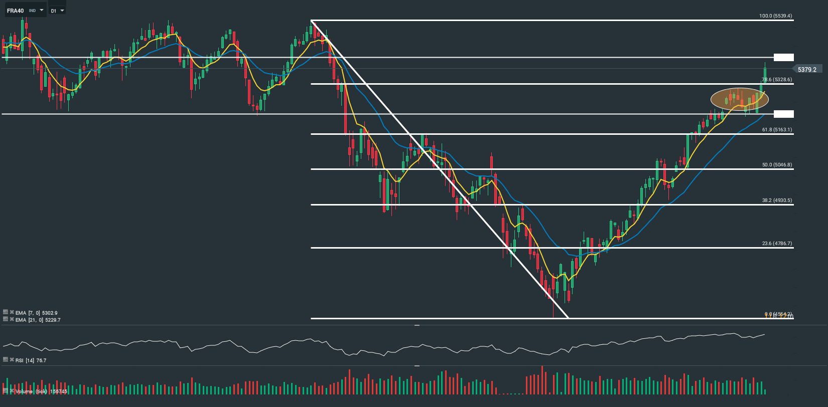 Sur le plan technique, en horizon temporel journalier (D1), le CAC40 termine la semaine en beauté. Le seuil des 78,6 % des retracements de Fibonacci (correspondant au niveau des 5 328 points) a été franchi de manière spectaculaire. Durant la phase de consolidation datant du 1er mars, les marchés étaient à la recherche de « catalyseurs » permettant la poursuite du mouvement haussier initié en début d’année. Le cocktail « Brexit/quatre sorcières » a permis à l’indice de retrouver une deuxième jeunesse. Toutefois, bien que les cours soient soutenus par les moyennes mobiles de court terme, nous devons avoir en tête que la semaine prochaine sera animé par les banquiers centraux. Dès lors, en attendant les propos des autorités monétaires, il est probable que les marchés entre dans une période de prise de profits. Prudence est mère de sureté. Nous avons un biais baissier sur l’indice, à court terme.
