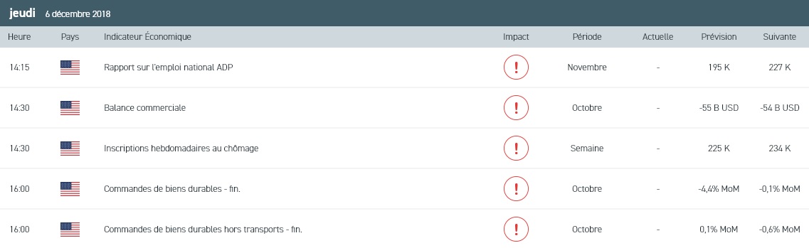 La séance du jour sera marquée par une véritable salve de données macroéconomiques. Outre le compte-rendu de la réunion ministérielle des pays de l’OPEP et OPEP+, nous nous intéresserons surtout à la publication du rapport ADP sur les créations d’emplois (du mois de novembre) dans le secteur privé et à l’indice ISM des services sur la même période aux Etats-Unis. En outre, la directrice financière (et fille du fondateur) du groupe Huawei a été arrêtée au Canada (à la demande des Etats-Unis) pour violation des sanctions américaines sur l’Iran. Bien sûr, cette information est un véritable camouflet pour la trêve commerciale. Sans grande surprise, les indices européens ont ouvert en forte baisse. Au moment où nous écrivons ces lignes, le DAX 30 (DE30) perd plus de 200 points et évolue sous le seuil psychologique des 11 000 points. Du côté des changes, l’euro s’inscrit en baisse face au dollar US et oscille autour des 1,1330 $ pour 1 €. La séance du jour promet d’être passionnante !