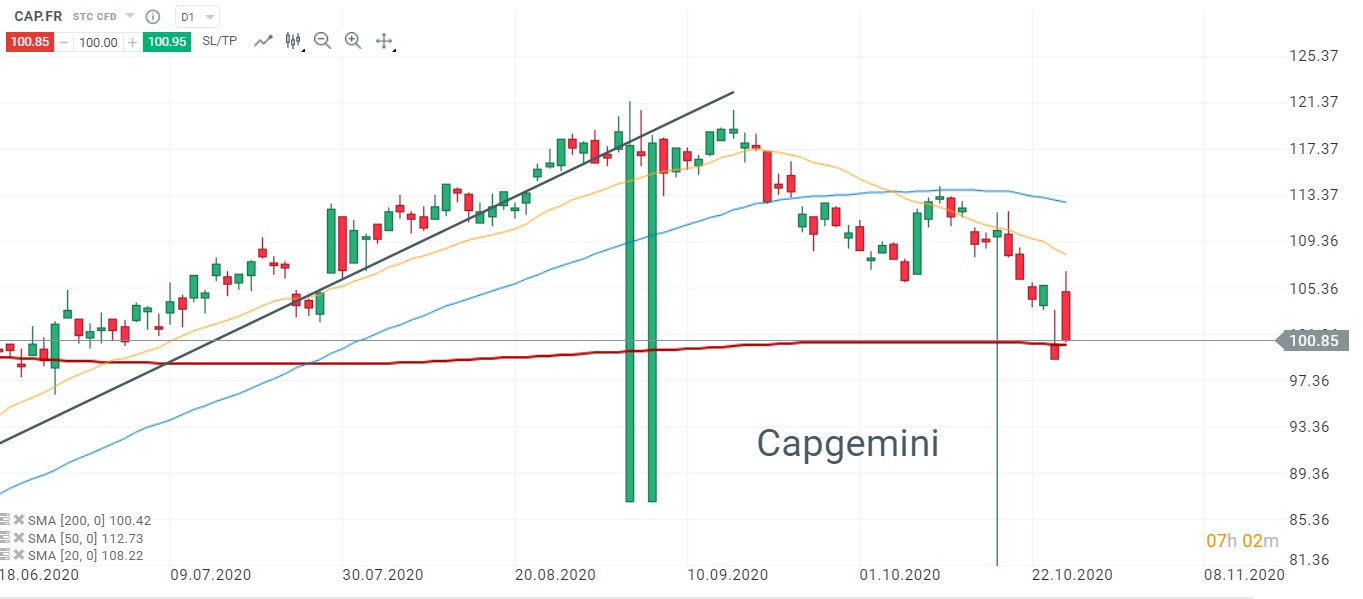 L'action Capgemini (CAP.FR) a débuté la séance avec un gap haussier de près de 6%, avant de se replier tout en gardant la tête du CAC40 avec une hausse de 1,72%. Les cours se situent actuellement à proximité de la SMA à 200 jours. Source : xStation5