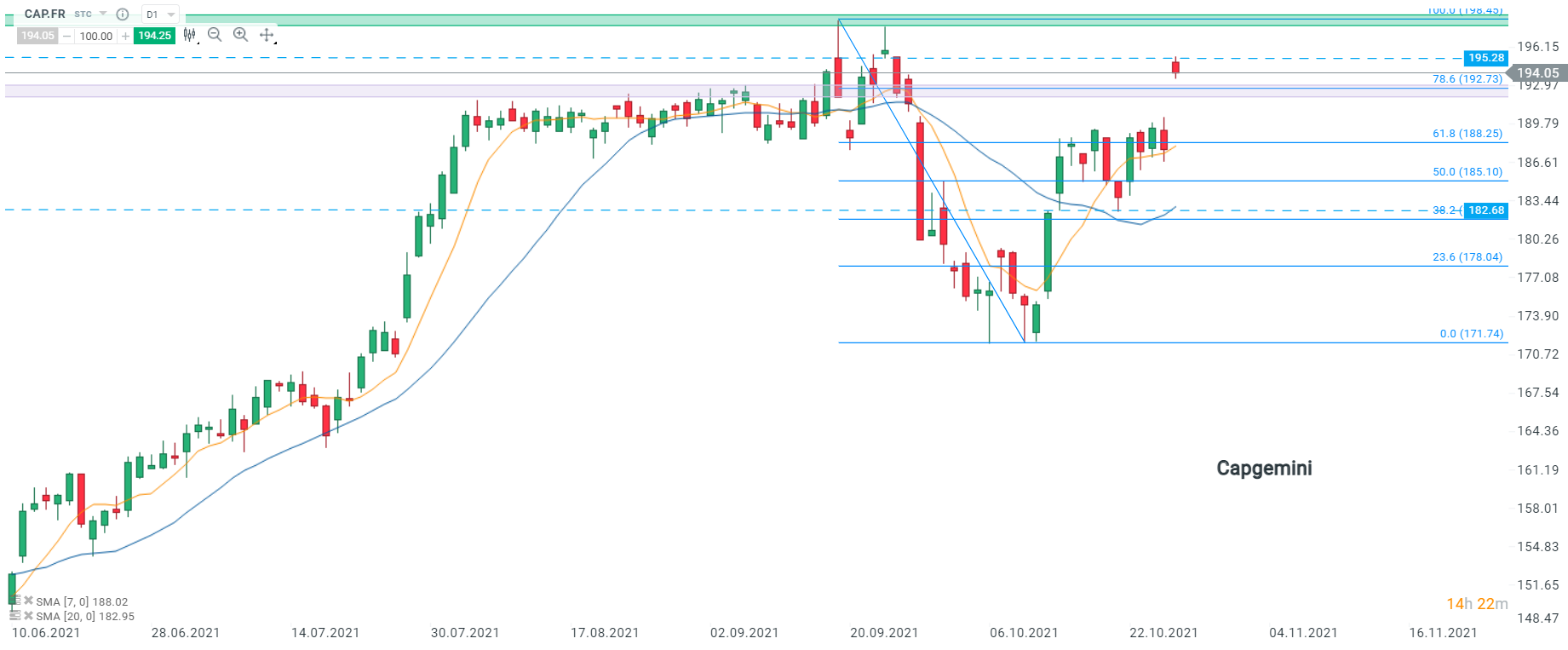 Les cours de Capgemini (CAP.FR) ont ouvert avec un gap haussier massif mais se sont repliés au contact de la résistance à 195,28. Au moment de la rédaction de ces lignes, le mouvement baissier se poursuit en direction du retracement de Fibonacci à 78,6% de la baisse du 17/09. Toutefois, si les acheteurs reprennent le contrôle, le retracement à 100% à 198,45 constitue la prochaine cible. Source : xStation5