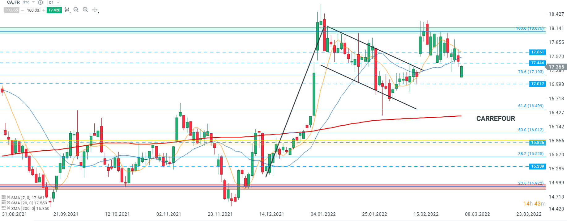 Les cours de Carrefour (CA.FR) ont entamé la première séance de la semaine à la baisse mais se sont redressés au contact du retracement de Fibonacci à 78,6% de la baisse de janvier 2021. Si les cours parviennent à rebondir sur ce niveau, le mouvement haussier pourrait s’étendre en direction de la résistance à 17,444 voire 17,661. Toutefois, si les cours venaient à casser le retracement susmentionné, alors le support à 17,017 serait à envisager. Source : xStation5