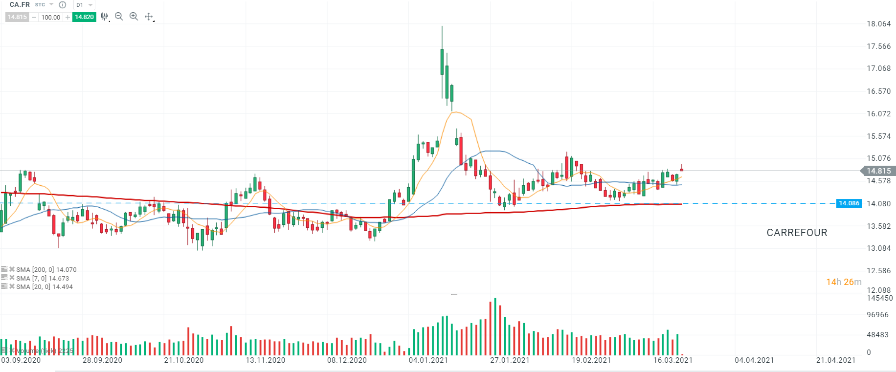Le titre Carrefour (CA.FR) a ouvert avec un léger gap haussier, qu’il tente de combler en se repliant vers la SMA 7 (ligne orange) au niveau des 14,675 au moment de la rédaction de ces lignes. Le prochain niveau à surveiller sera la SMA 20 (ligne bleue). Si le sentiment actuel prévaut, la cassure de ce niveau entraînerait une impulsion à la baisse vers la SMA 200 (ligne rouge) à 14,086 qui sert de niveau de support. Source : xStation5