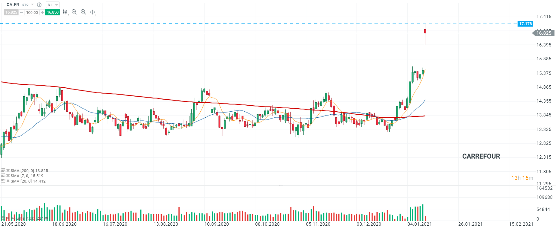 Les cours de Carrefour (CA.FR) ont ouvert avec un important gap haussier et se dirigent vers les sommets de septembre 2019 à 17,178. En cas de franchissement de ce niveau, le mouvement à la hausse pourrait s’accélérer vers les sommets d’août 2019 au niveau de 18,075. Source : xStation5