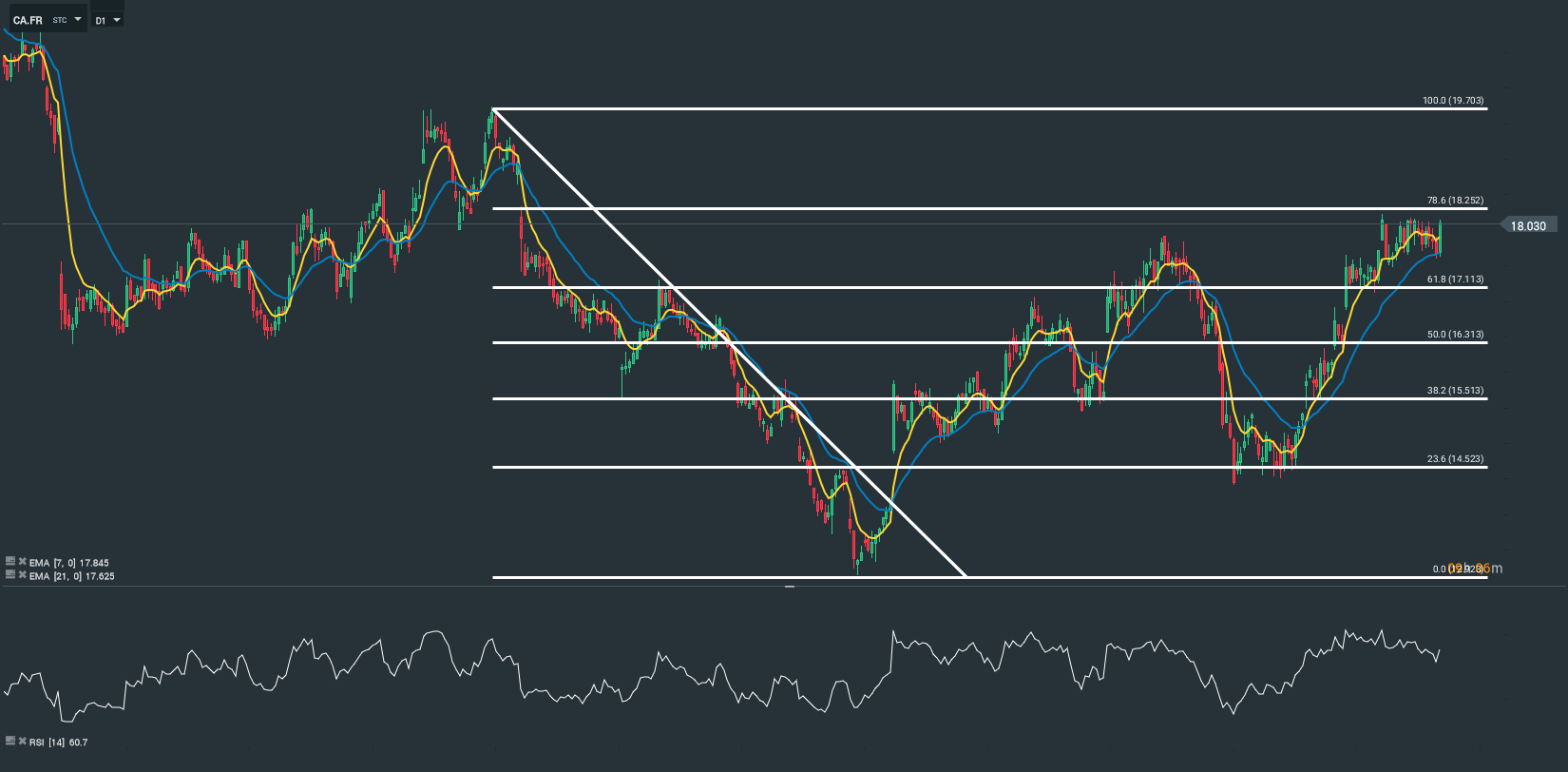 Sur le plan technique, en horizon temporel journalier (D1), l’action navigue en territoire positif. Le RSI est orienté à la hausse et oscille au-dessus de sa zone de neutralité. Cependant, nous remarquons la formation d’un croisement de moyenne mobile à 7 et 21 périodes. De plus, les prix sont capés par une résistance de long terme (au niveau des 18,25 euros). Pour l’heure, nous avons un biais haussier sur l’action carrefour.