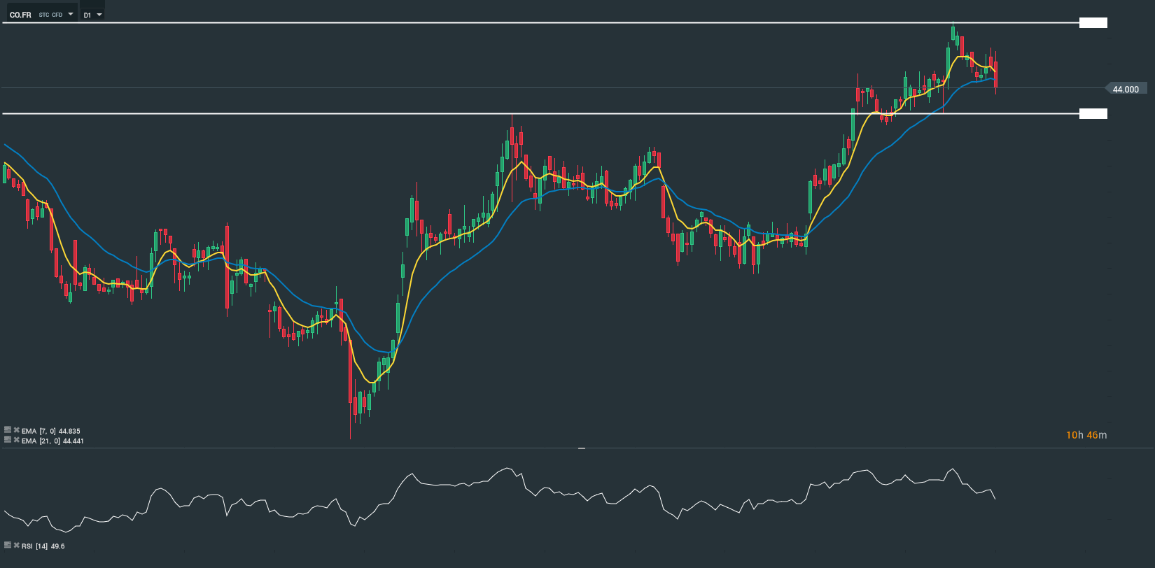 Sur le plan technique, en horizon temporel journalier (D1), l’action Casino évolue en baisse. Les cours se sont affranchis, vers le bas, des moyennes mobiles de court terme (7 et 21 périodes). Le RSI est orienté à la baisse, et oscille en dessous de sa zone de neutralité. Nous avons un biais neutre sur l’action, court terme.