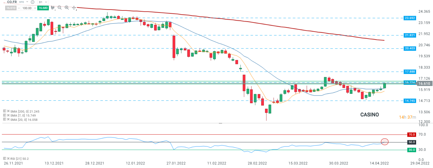 Les cours de Casino (CO.FR) ont entamé leur sixième séance consécutive à la hausse, portés par les chiffres encourageants du groupe. Au moment de la rédaction de ces lignes, les cours tentent de franchir la résistance à 16,724. On remarque d’un point de vue technique, que le RSI s’apprête à franchir à la hausse la zone de neutralité signifiant que les acheteurs s’apprêtent à prendre le contrôle. En cas d’échec, un retour au support à 14,745 serait à envisager. Source : xStation5